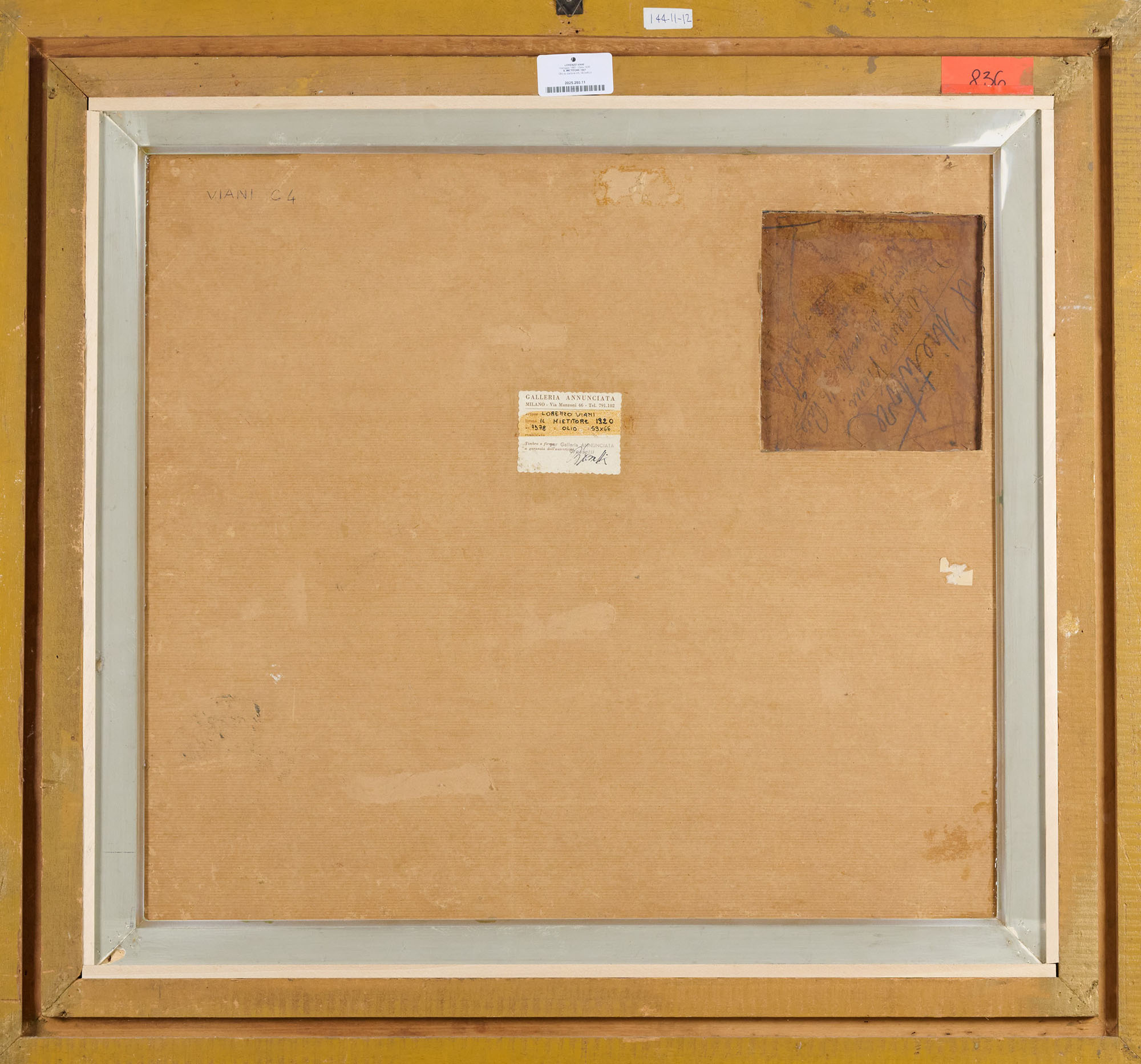 Sul verso: firma, titolo, cenni di provenienza ed etichetta galleria Annunciata, Milano, con descrizione.