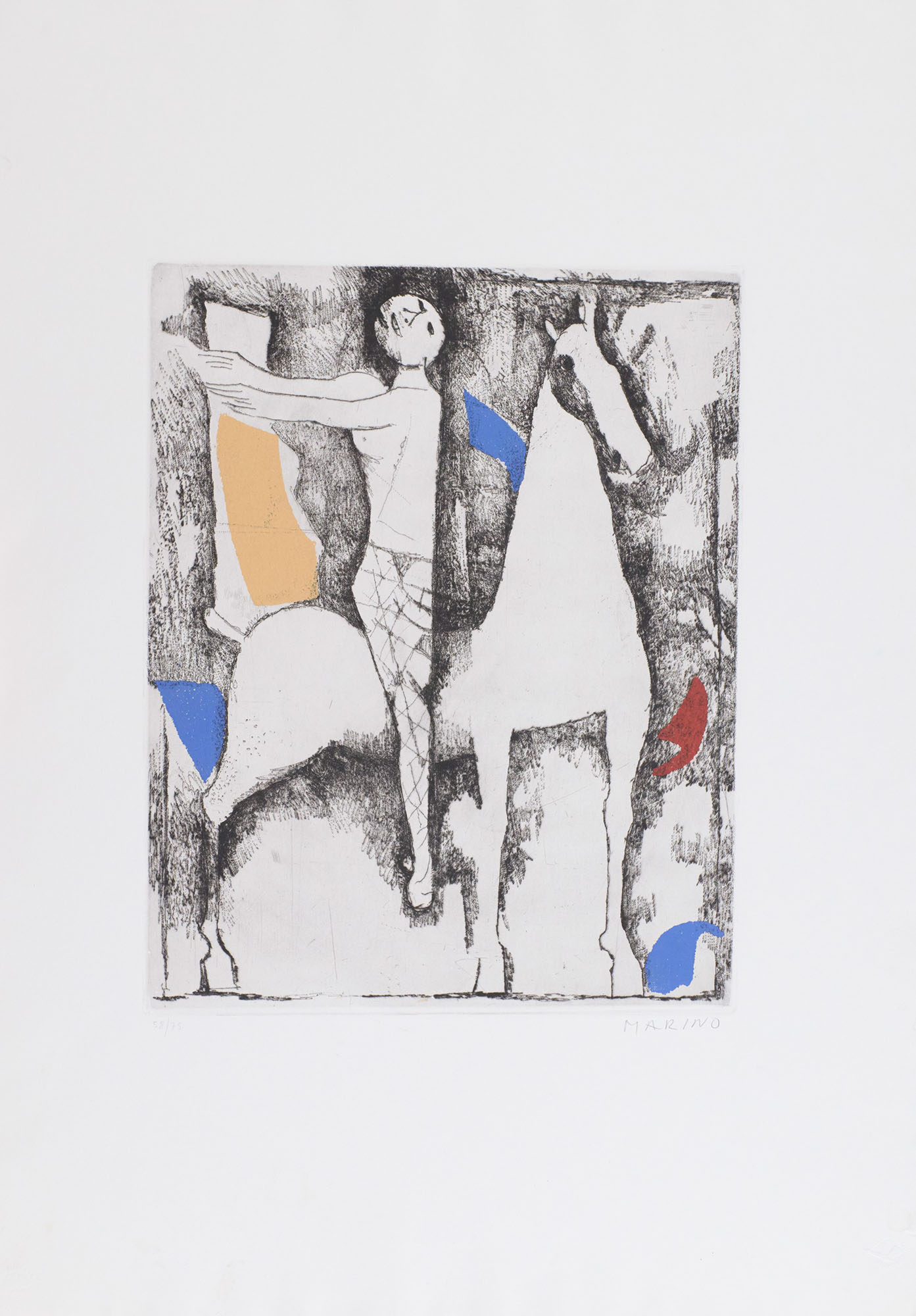 7) Trovatore, Puntasecca Acquatinta a 3 colori, Lastra cm 31,5x40. Firma e numerazione "Marino 58/75". Timbro a secco dello stampatore "Il cigno stamperia d'arte".