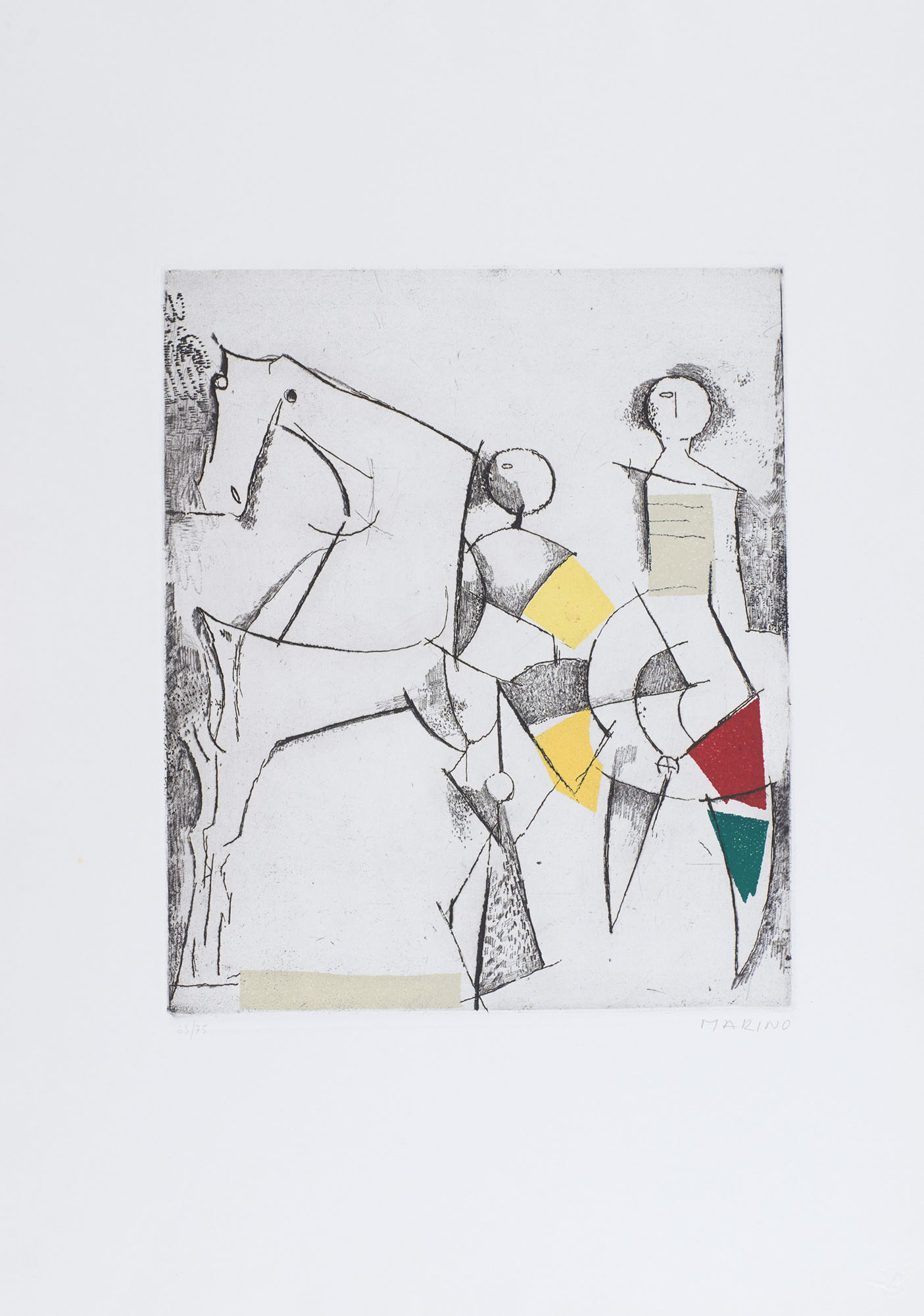 9) I Giochi, Puntasecca Acquatinta a 3 colori, Lastra cm 29x31. Firma e numerazione "Marino 63/75". Timbro a secco dello stampatore "Il cigno stamperia d'arte".