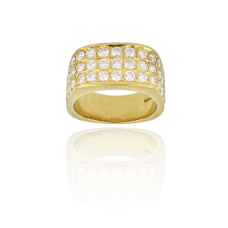 Anello a fascia squadrata in oro giallo la parte superiore decorata con 3 file di diamanti taglio brillante per ct. 2 0 ca.