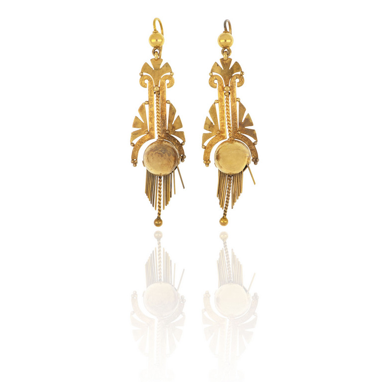 Fini orecchini pendenti in oro rosso di epoca vittoriana (1870 circa) con gancio a monachella aperto.
