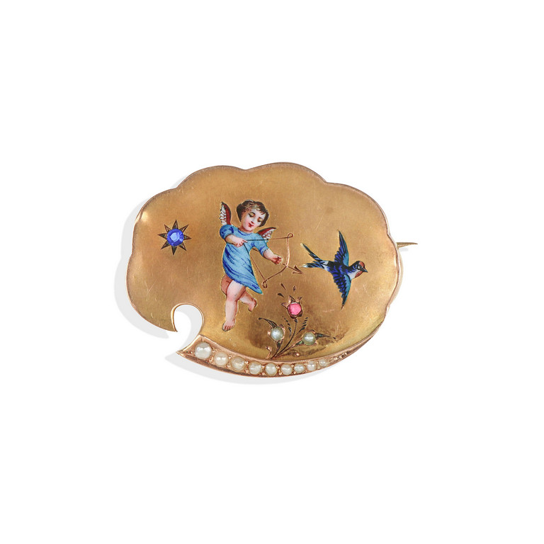 Delicata spilla di fine 800 a guisa di nuvola in oro rosso acidato con fine disegno rappresentante cupido rondine e fiorellino.