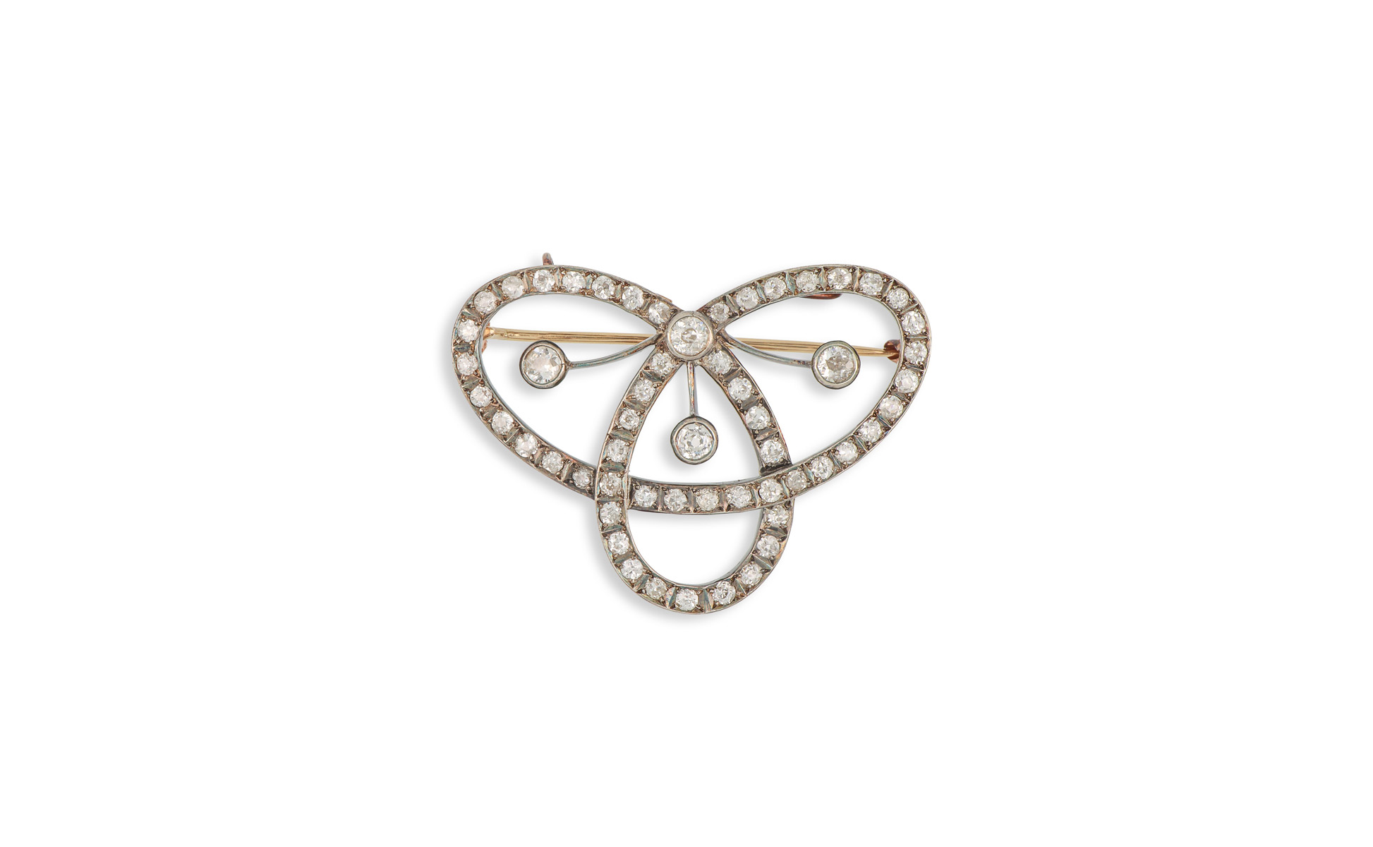 Spilla in oro e argento di fine 800 a volute decorate con diamanti di taglio antico ottimo lavoro di aggiorno sul retro.