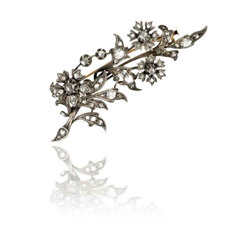 Spilla di antica manifattura in oro e argento a forma di tralcio fiorito è adornata con diamanti taglio rosa.