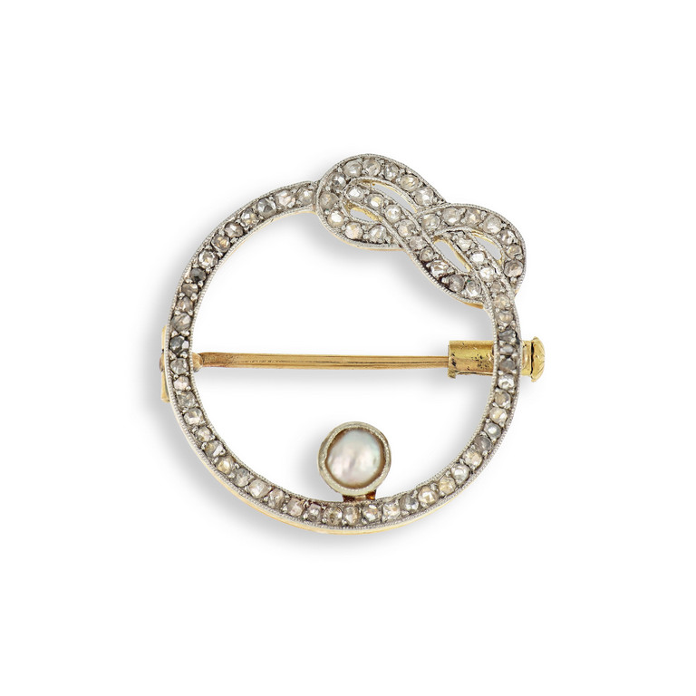 Spilla in oro giallo e argento di forma circolare con nodo Savoia piccoli diamanti taglio rosa e madreperla a decoro.