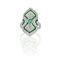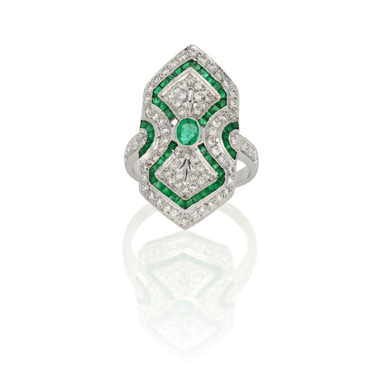 Anello in oro bianco in stile decò con delicata geometria esagonale a cornice con piccoli smeraldi (uno mancante) e pavè di diamanti.