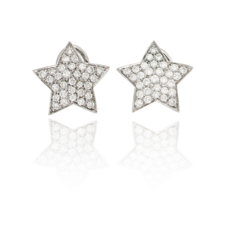 Orecchini in oro bianco a forma di stella con pavè di diamanti di forma rotonda taglio a brillante per stimati 0 80 ct. Chiusura a clip con perno.