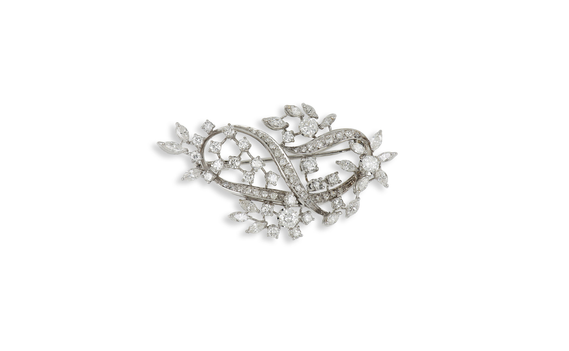 Fantasiosa spilla in oro bianco un ramage di diamanti taglio brillante e navette sboccia sulle sinuose volute di un nastro ct. 2 80 ca.
