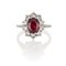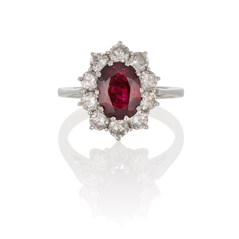 Elegante anello a margherita in oro bianco al centro un rubino rosso intenso di ct. 1 40 ca. contornato da 10 diamanti taglio brillante per ct. 1 0 ca.