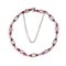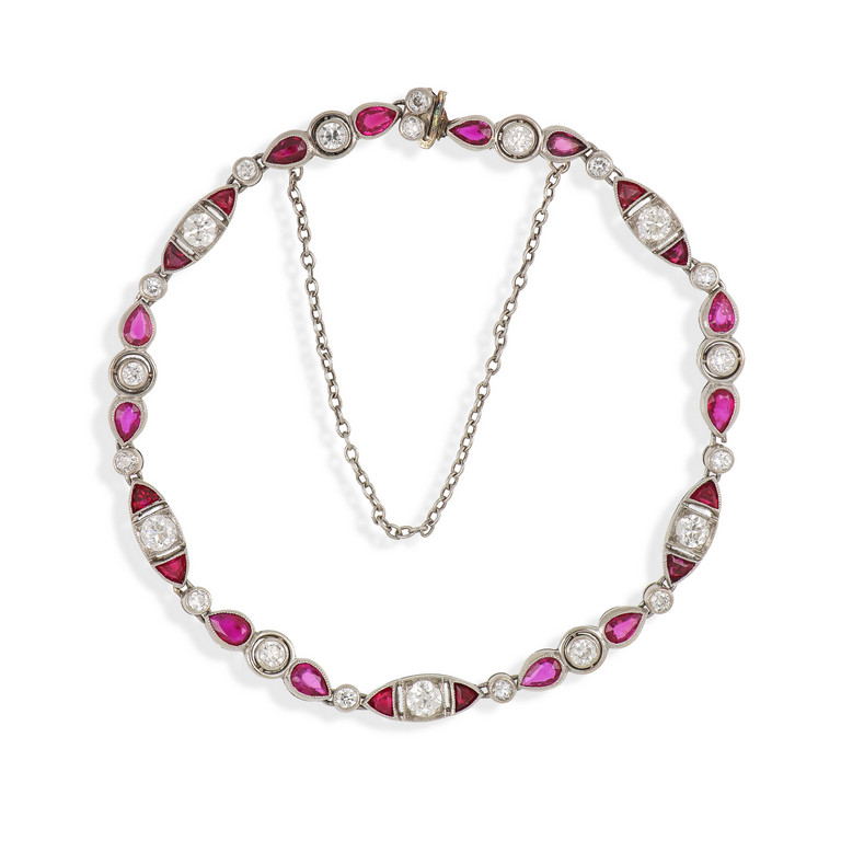 Fine bracciale in platino di anni 30 con diamanti di taglio antico e rubini di ottimo colore e qualità. Curiosa chiusura a baionetta laterale e catenina di sicurezza.