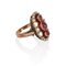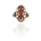 Anello ovale di antica manifattura realizzato in oro rosso al centro 3 rubini taglio cabochon sono contornati da diamanti taglio rosa a decoro del motivo elegantemente traforato.