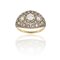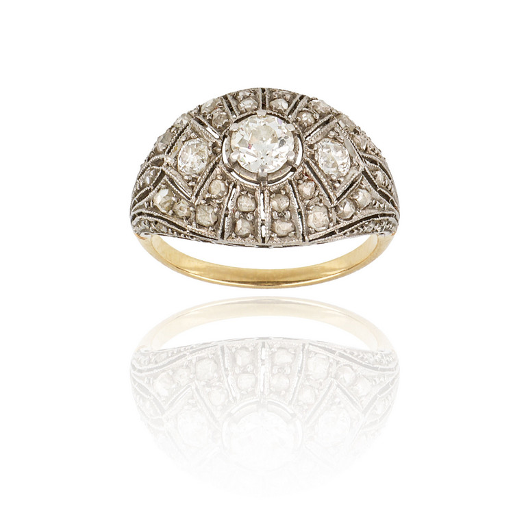 Elegante anello in platino e oro giallo il motivo a boule è decorato con esile traforo e incisioni piccoli diamanti illuminano la superficie uno al centro taglio vecchia europa per ct. 0 30 ca.