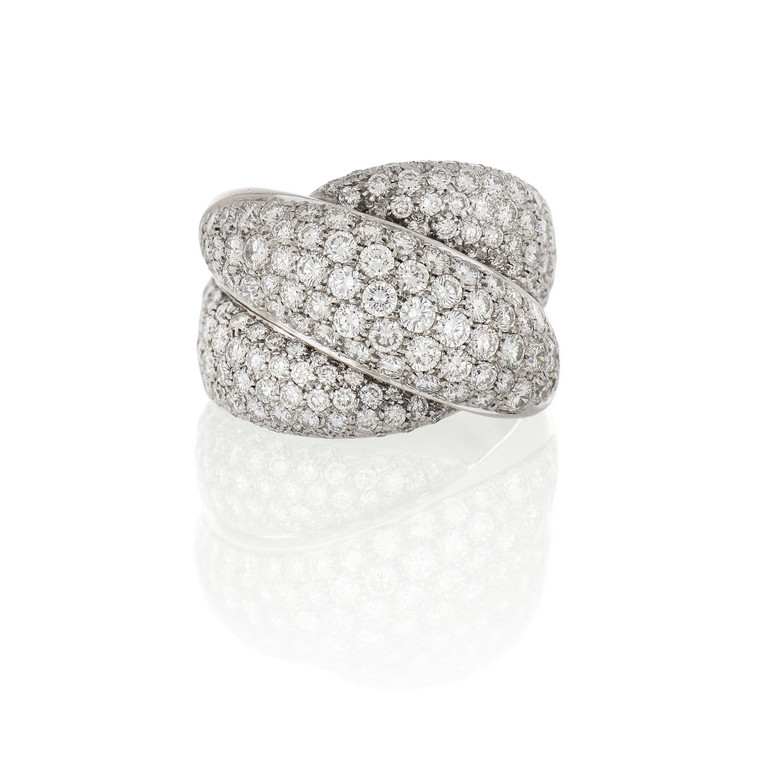 Anello a fascia incrociata in oro bianco interamente pavettato con piccoli diamanti taglio brillante per ct. 3 0 ca.