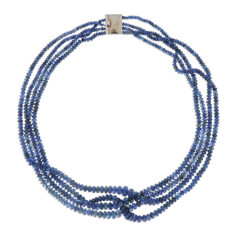 Collana girocollo con circa 500 ct di zaffiri tagliati a briolette e disposti su quattro fili a scalare chiusura in oro bianco.