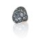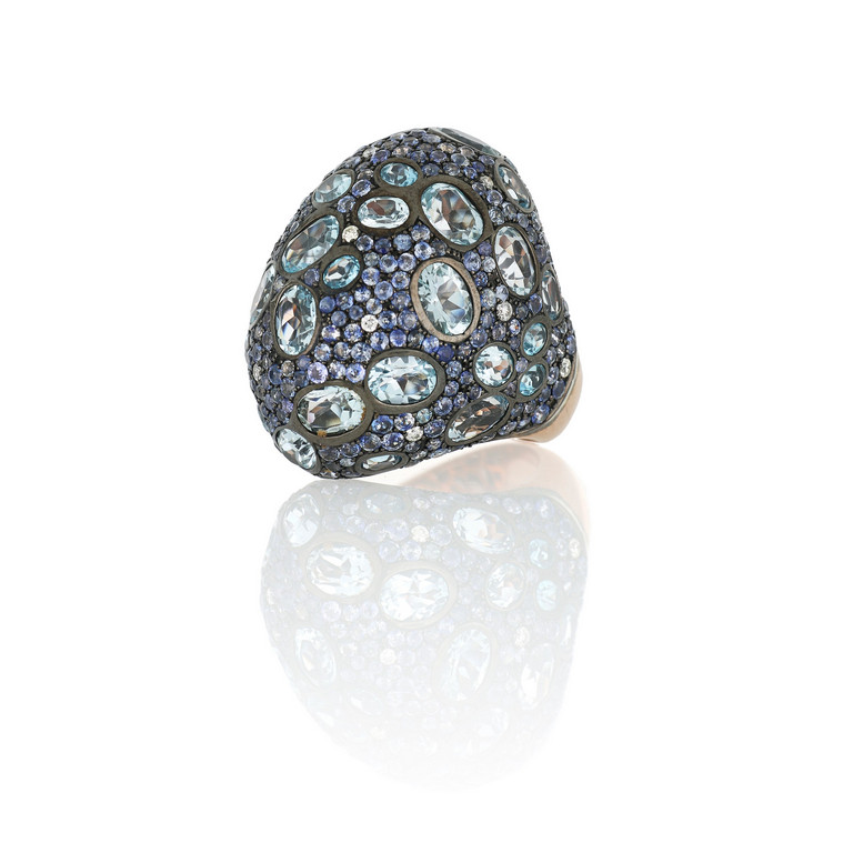Grande anello a boule con gambo in oro rosso di basso titolo e testa in argento brunito con pietre di colore naturali in nuance azzurra corindoni berilli topazi.