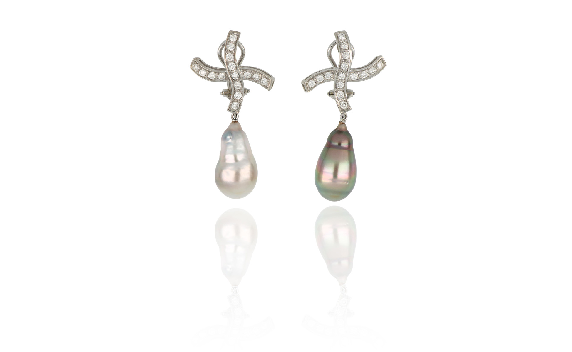 Orecchini pendenti in oro bianco con due perle coltivate barocche periformi una grigia e l'altra nera struttura ad X con diamanti di forma rotonda incastonati per un complessivo stimato di 1 5 ct.