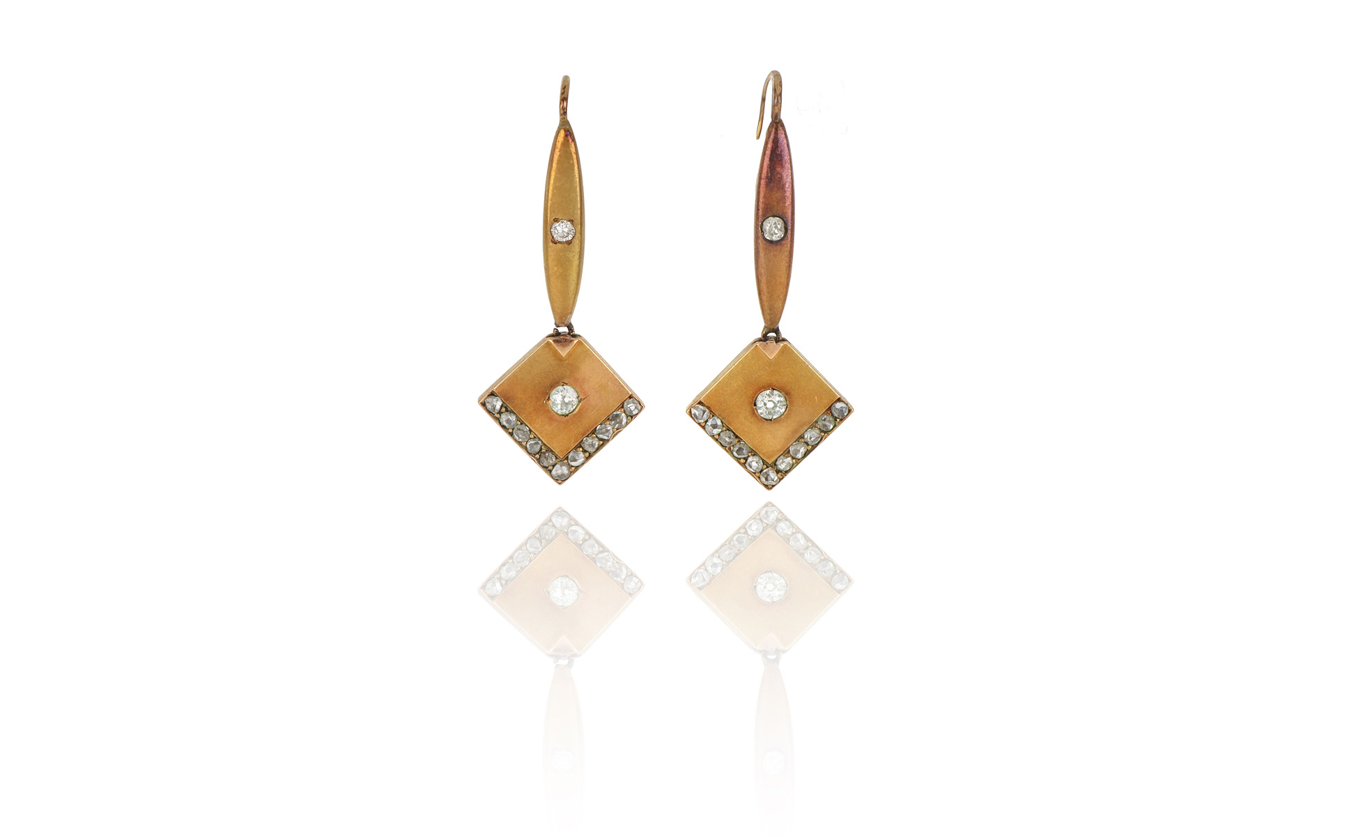 Orecchini pendenti in oro rosso satinato a forma di rombo con piccoli diamanti. Chiusura a monachella