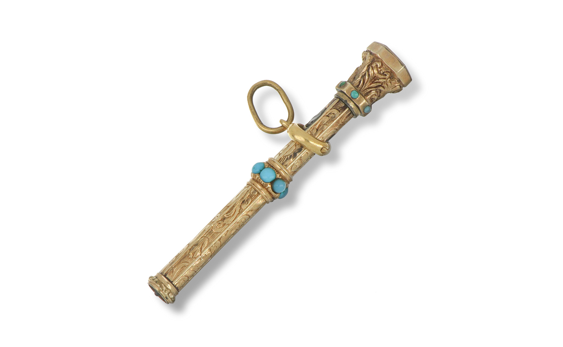 Ciondolo matita di fine manifattura in oro giallo inciso e con riporti di turchese funzionante.