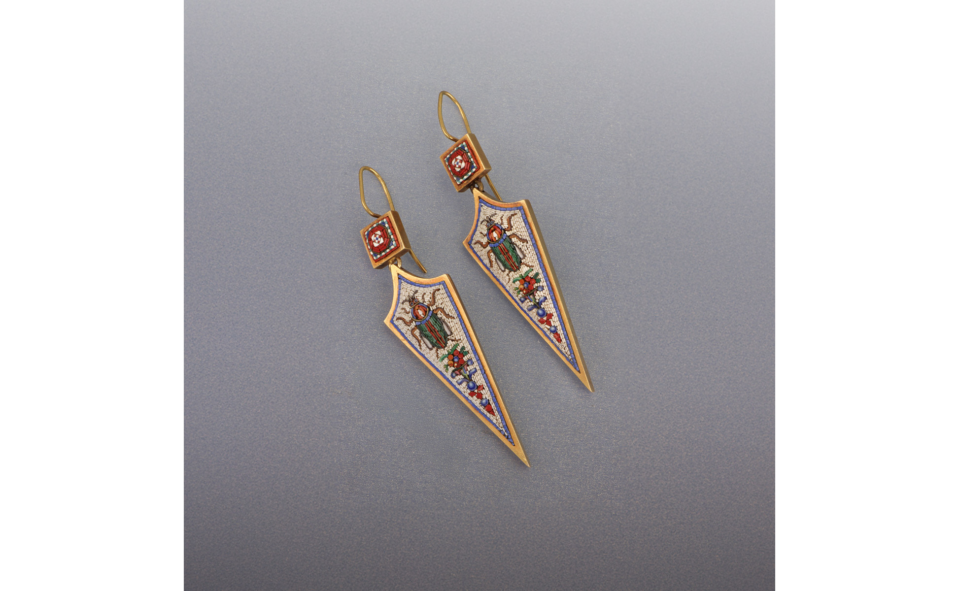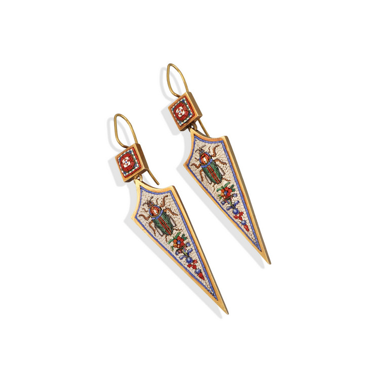 Stupendi orecchini in oro epoca vittoriana retour d'egypte con micromosaico policromo di rara bellezza chiusura a monachella.