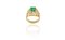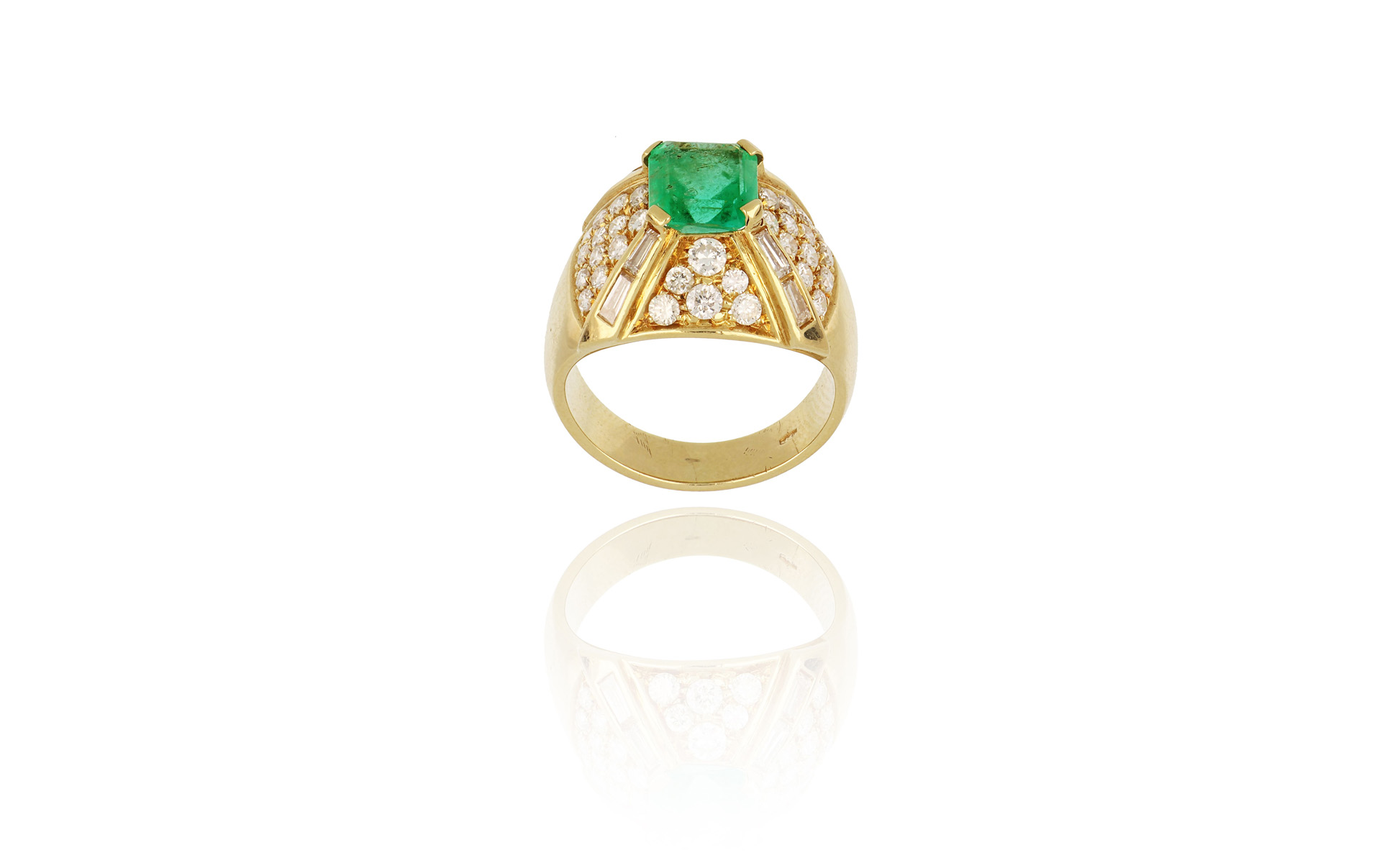 Anello in oro giallo di forma piramidale alla sommita' uno smeraldo taglio quadrato di ct. 1 30 ca. sui 4 lati diamanti taglio brillante e baguette per ct. 1 10 ca.
