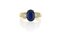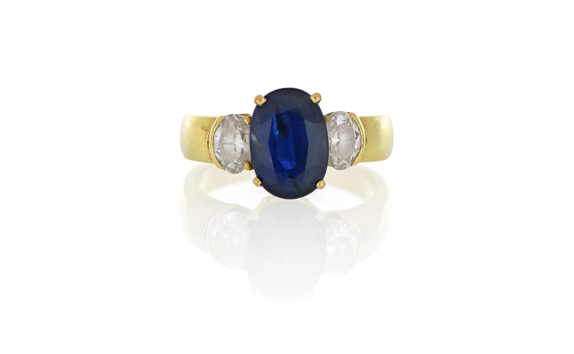 Anello a tre pietre in oro giallo con zaffiro centrale ovale di stimati 3 80 ct e due diamanti ovali laterali del peso complessivo di stimati 1 ct.
