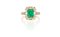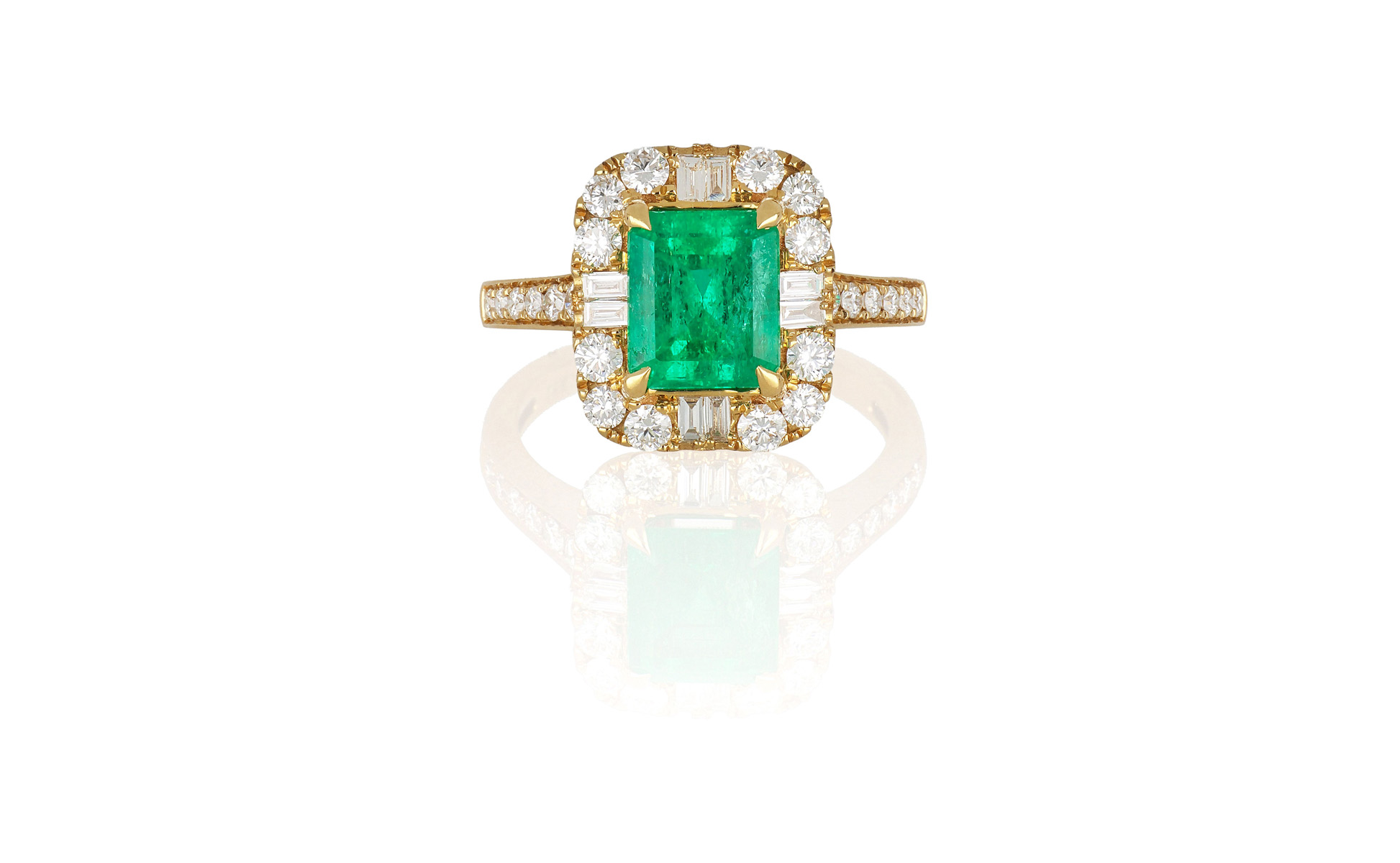 Anello in oro giallo con elegante contorno in diamanti di forma rotonda taglio a brillante e baguette e smeraldo centrale colombiano di stimati 2 ct circa.