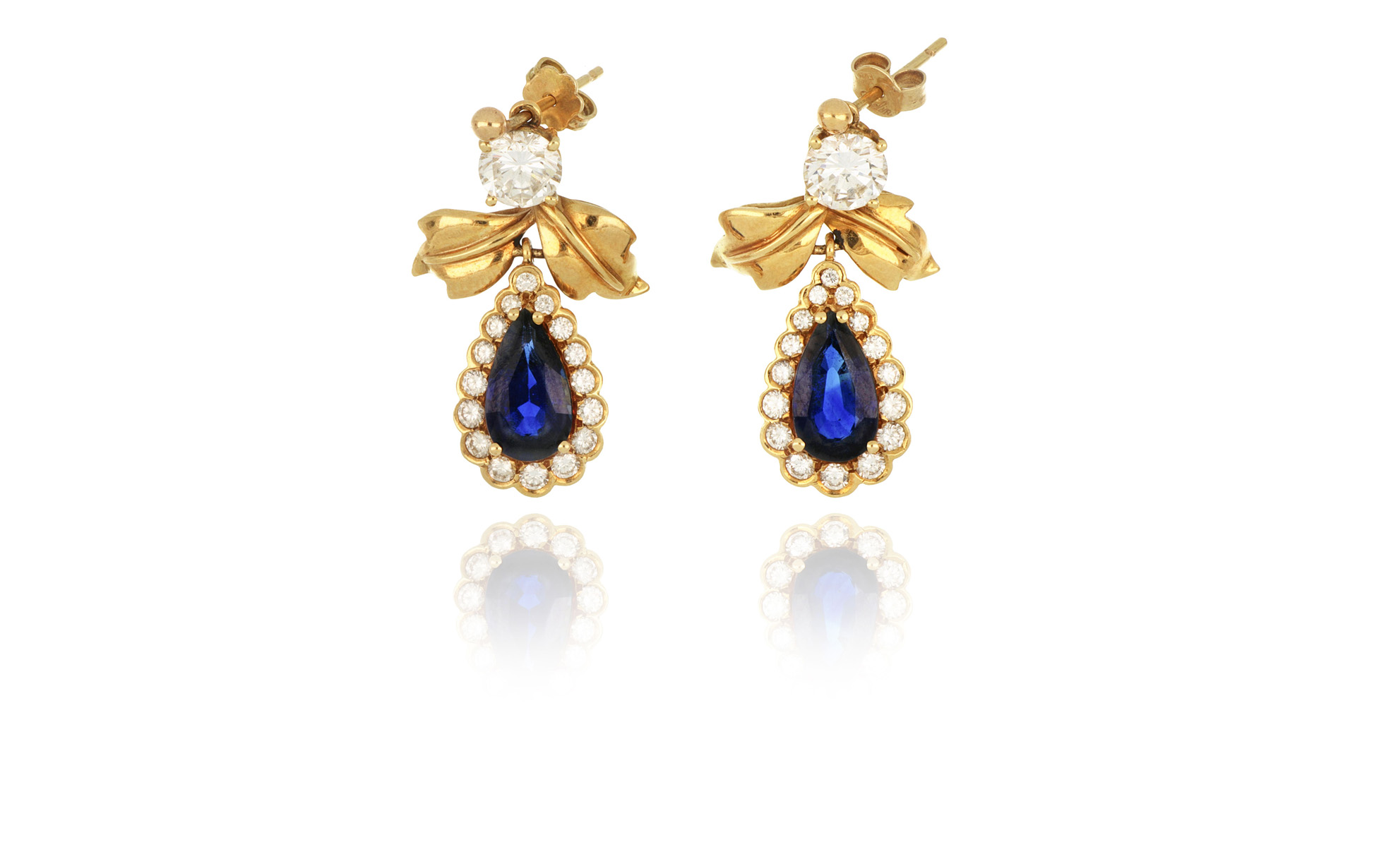 Orecchini pendenti in oro giallo con due diamanti di forma rotonda taglio a brillante per stimati 1 50 ct complessivi e due zaffiri di forma a goccia per stimati 5 ct complessivi.