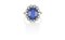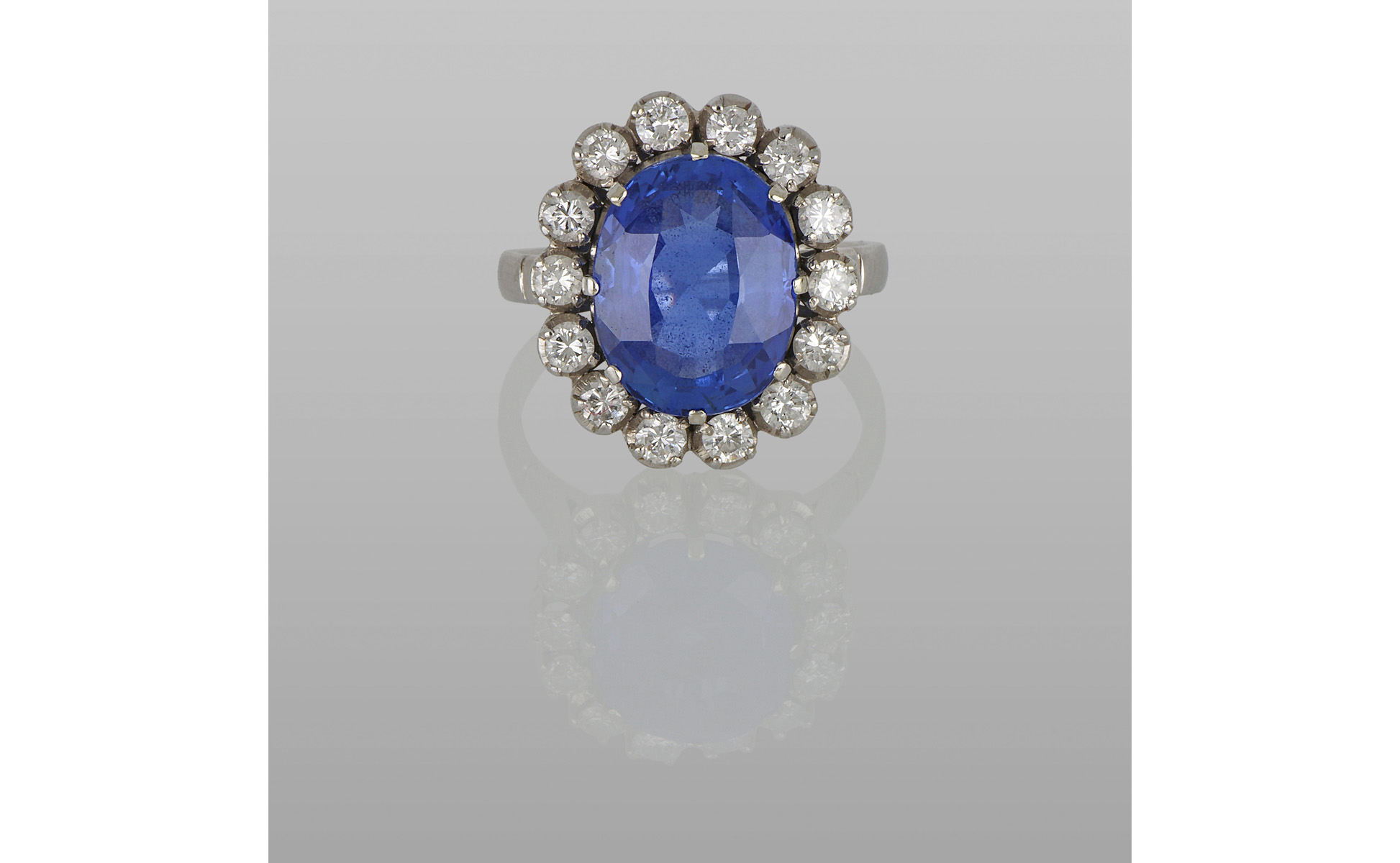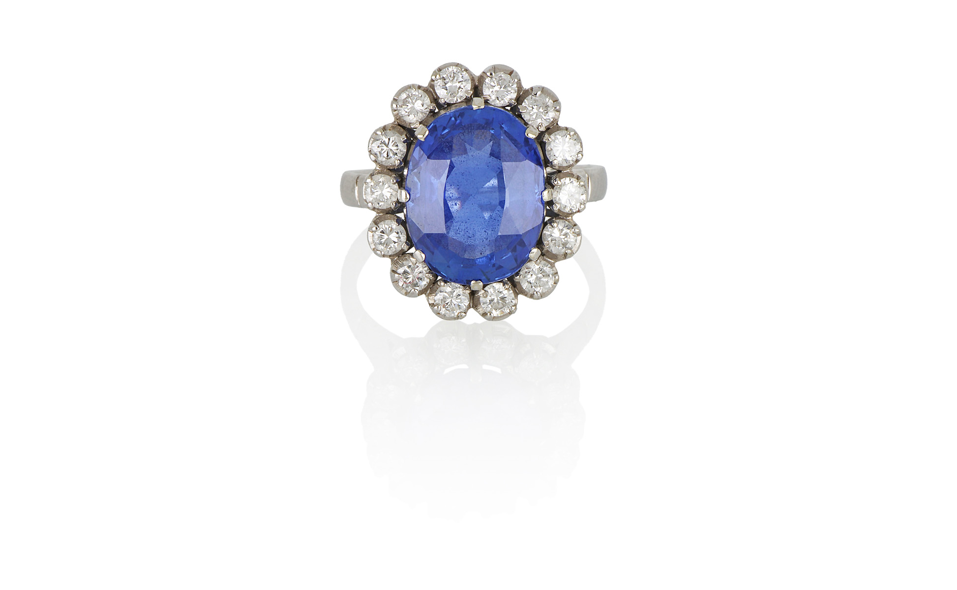 Anello in oro bianco con contorno a margherita con diamanti di forma rotonda taglio a brillante per stimati 0 7 ct complessivi. Zaffiro di forma a cuscino di stimati 5 70 ct accompagnato da report gemmologico CISGEM attestante l'origine Cylon e l'assenza di trattamento termico.
