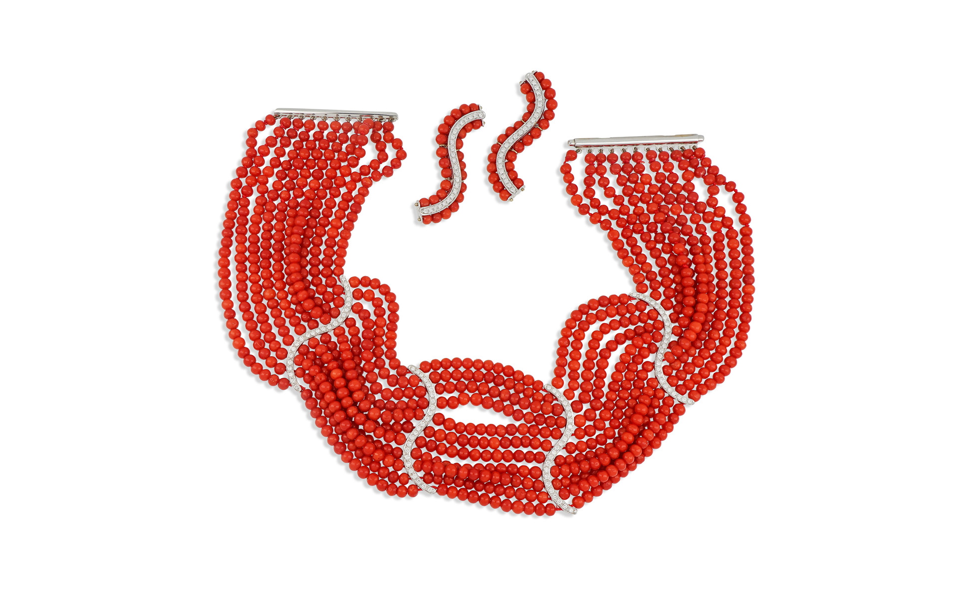 CHIAPPE Genova - Parure formata da collana girocollo e orecchini in oro bianco con 11 fili composti da sfere di corallo rosso di circa 4 5 mm di diametro e distanziali in oro bianco con incastonati diamanti di forma rotonda taglio a brillante per stimati 7 2 ct complessivi.