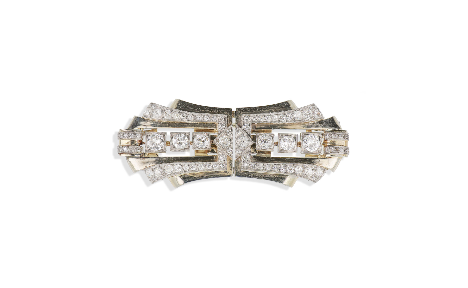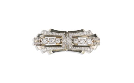Spilla decò a doppia clips smontabili in oro bianco e platino di manifattura francese a decorare diamanti di taglio antico per stimati complessivi ct.2 5