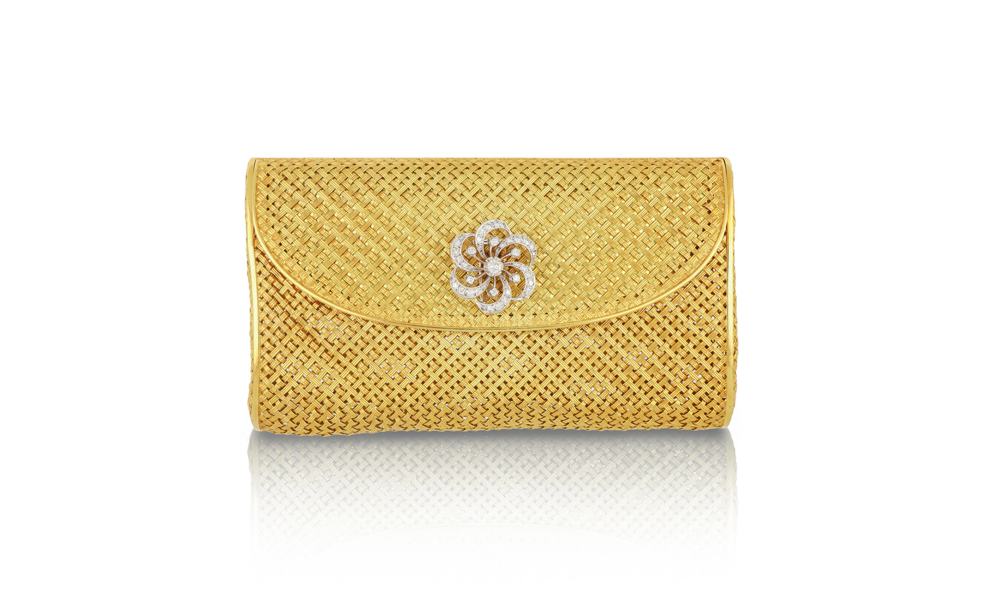 Elegante pochette in oro giallo a trama incrociata con chiusura a rosone in oro bianco e diamanti per stimati 1 20 ct complessivi. Specchio interno. Italia anni 50/60 punzonata 866AL.