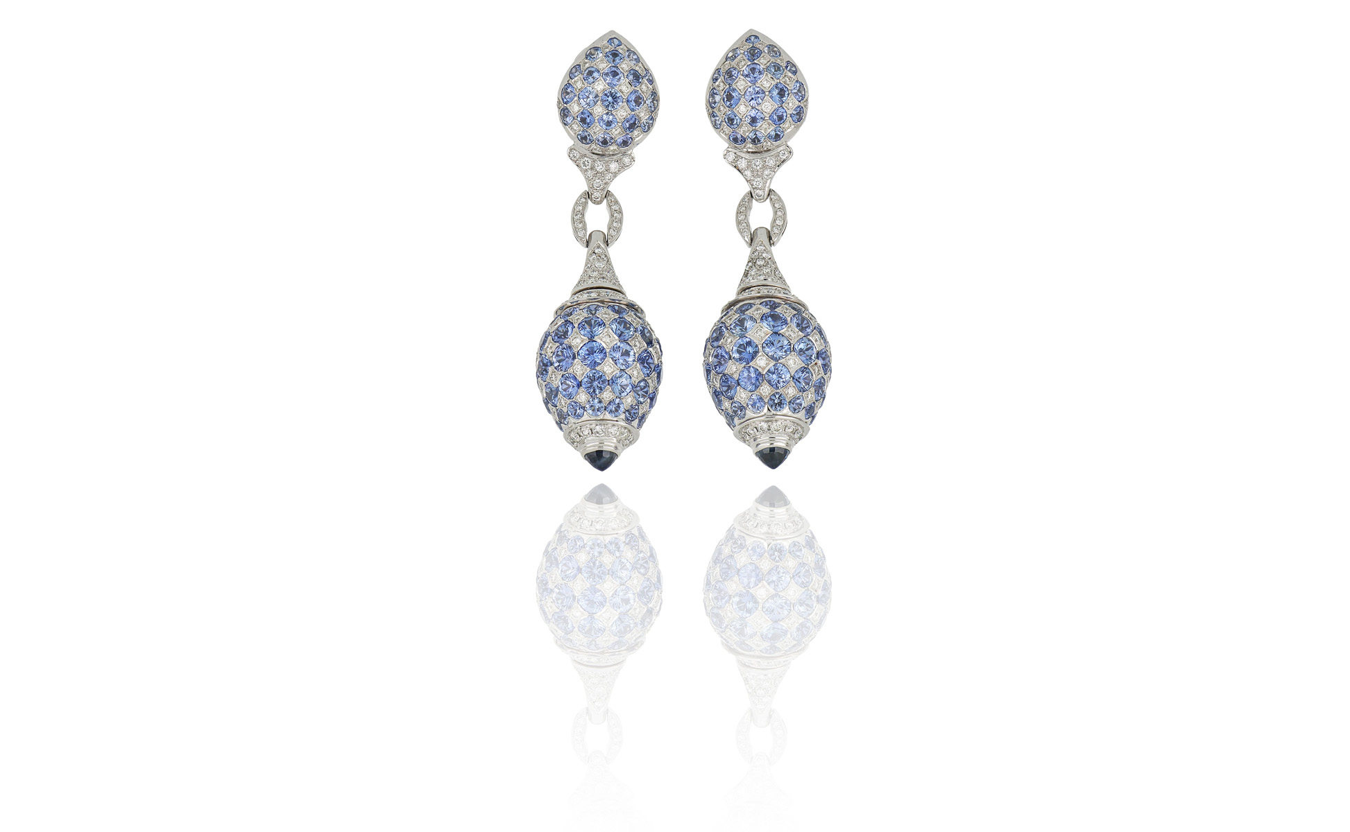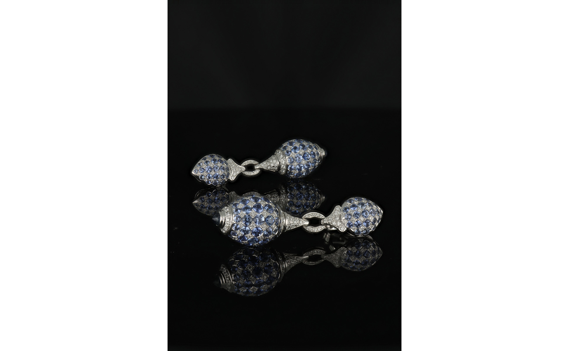 Importanti e fascinosi orecchini in oro bianco a due settori snodati con pigna pendente completamente incassata a pavè di diamanti per stimati 3 ct e zaffiri fiordaliso per stimati 21 ct. Chiusura a clip con perno facoltativo basculate.