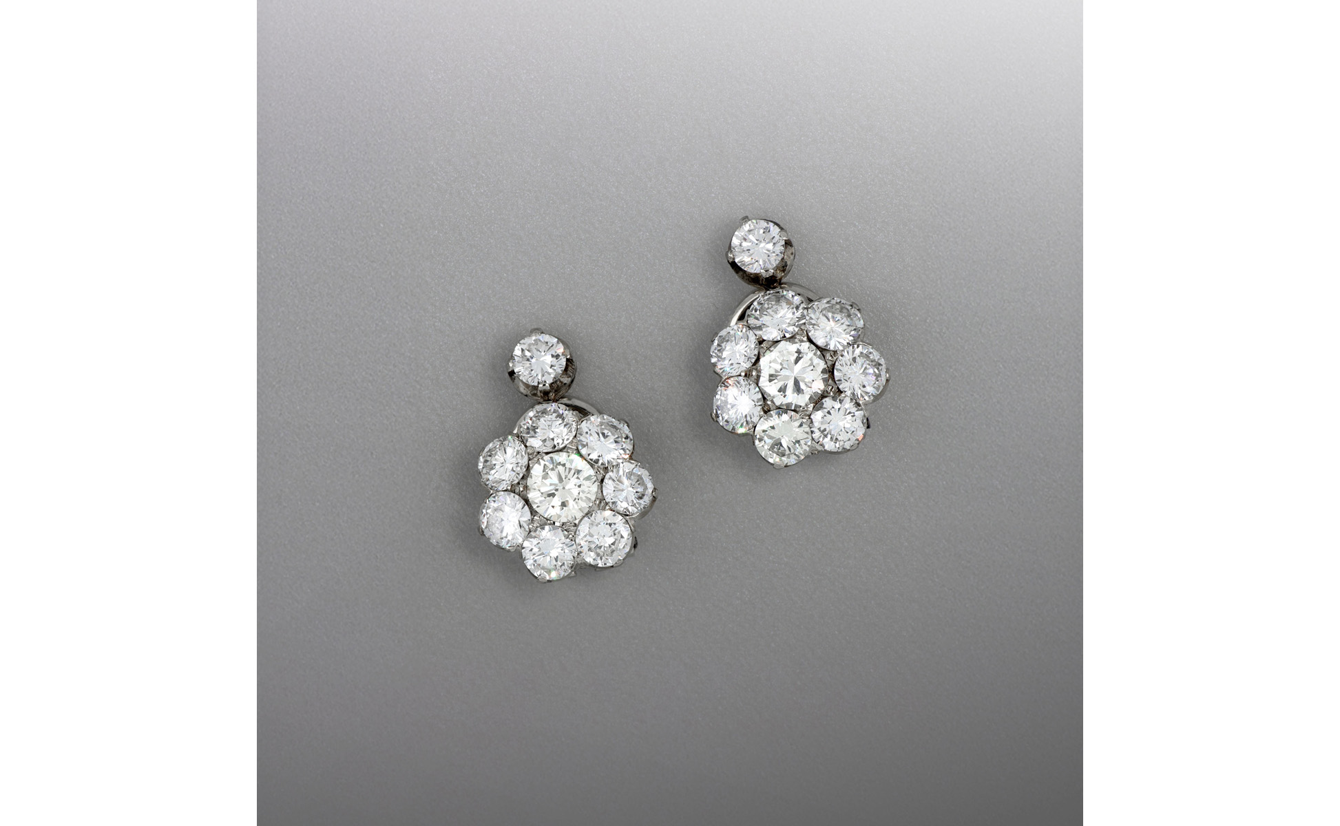 Orecchini in oro bianco a margherita 7 diamanti taglio brillante fanno da contorno ad un altro centrale un altro a sentinella sopra la composizione ct. 5 0 ca.