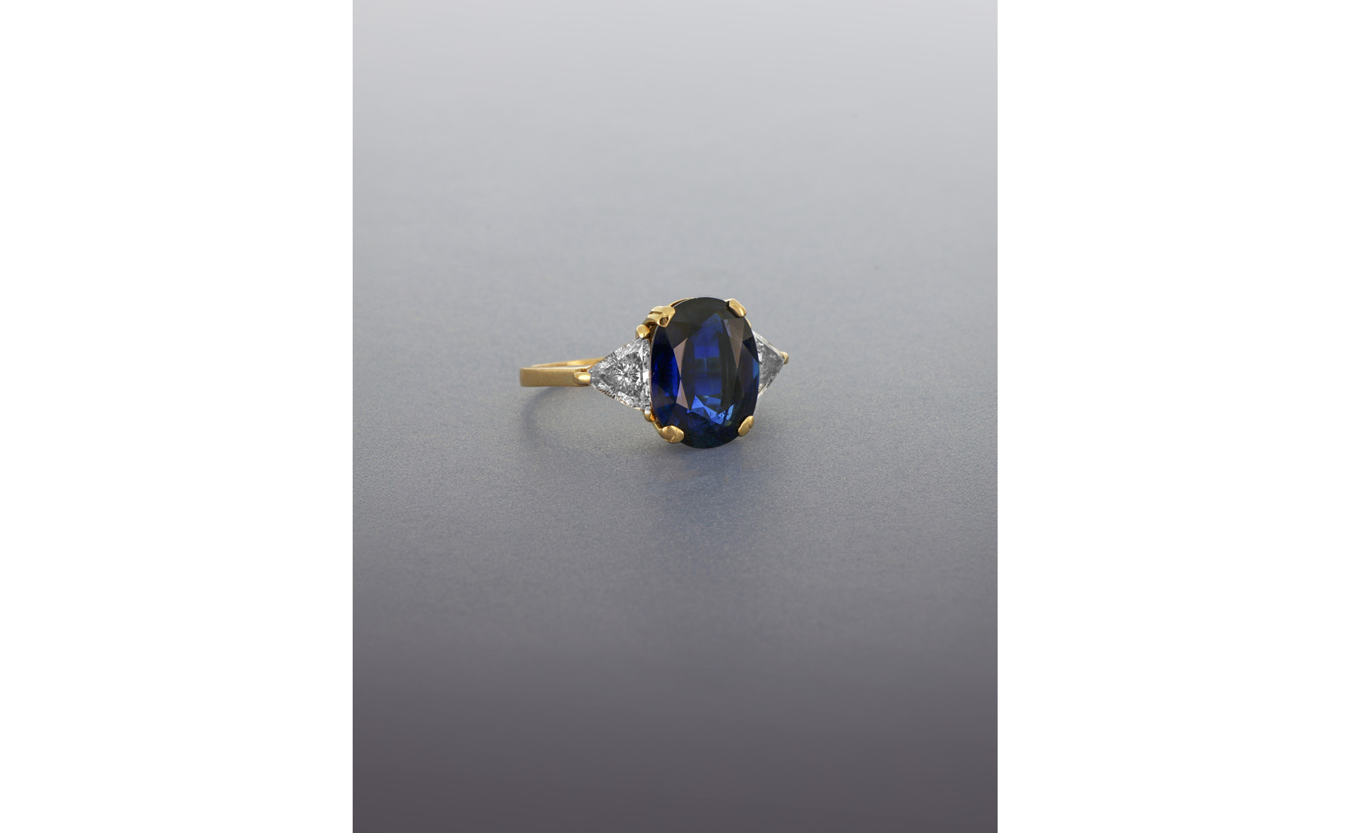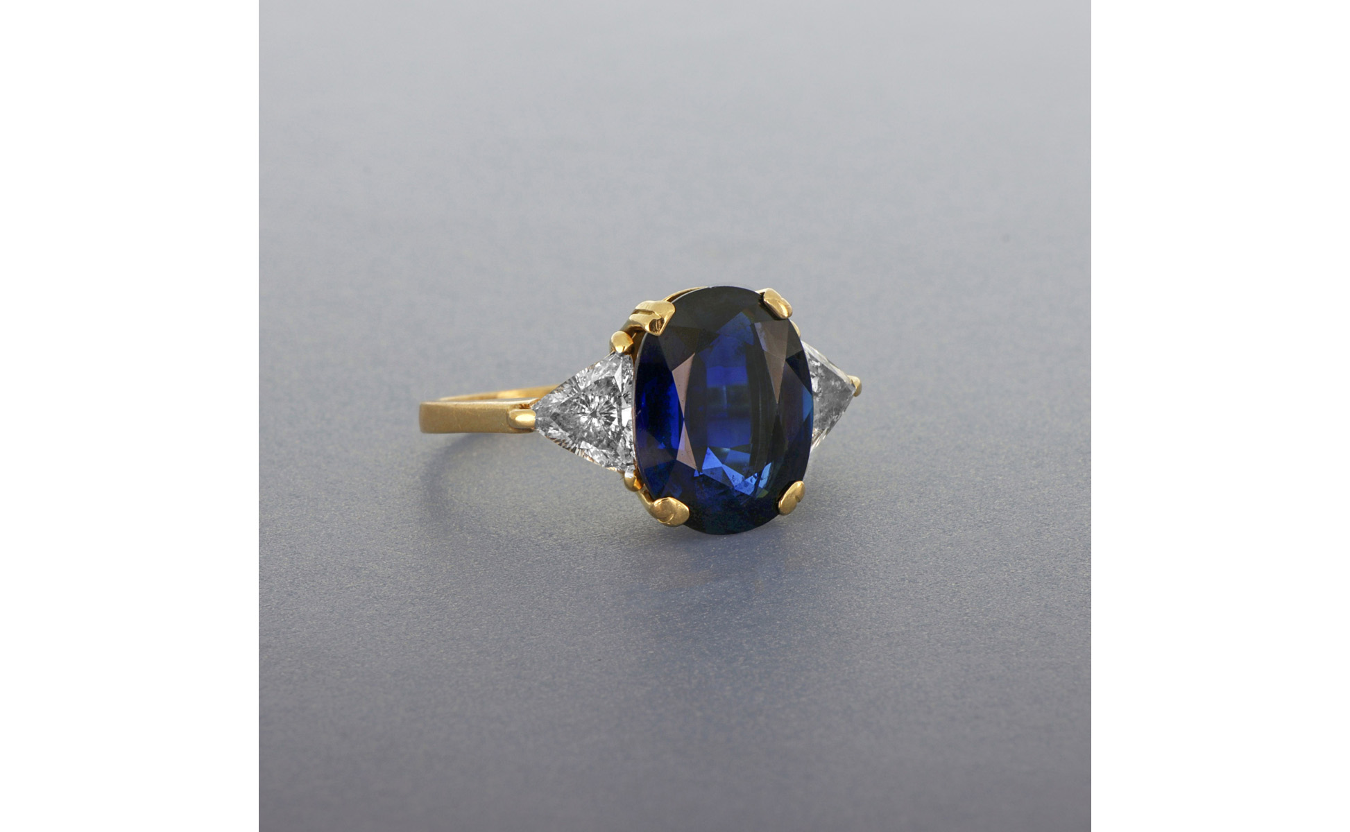 Elegante e classico anello in oro giallo a 3 pietre al centro uno zaffiro blu intenso taglio ovale di ct. 6 0 ca. ai lati due diamanti taglio triangolo di ct. 1 10 ca. complessivi.