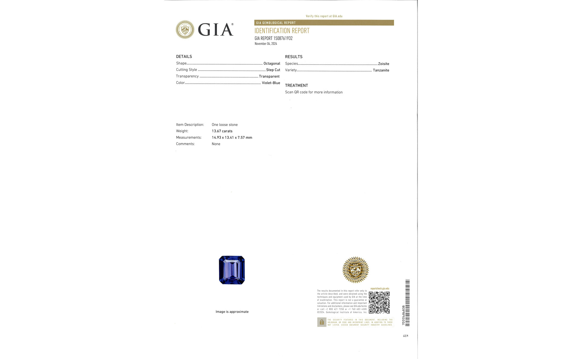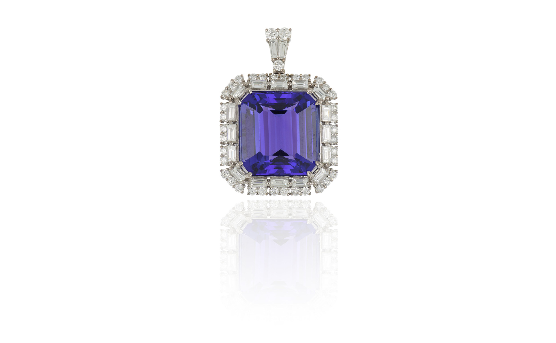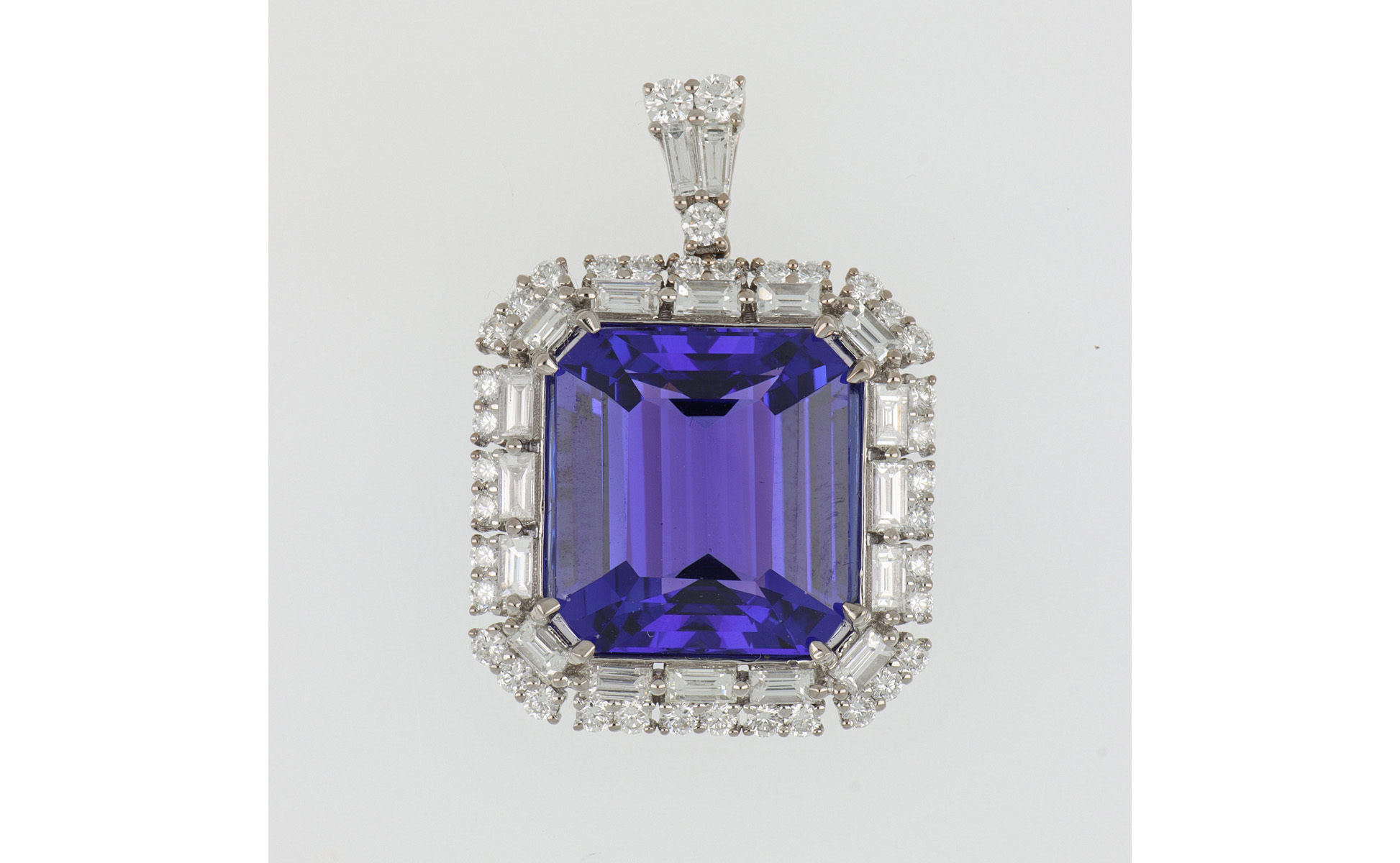 Ciondolo pendente in oro bianco con stupenda tanzanite di 13 67 ct di taglio ottagonale di ottimo colore accompagnata da report gemmologico GIA. L'intera cornice è impreziosita da circa 2 ct di diamanti di forma rotonda e baguette.
