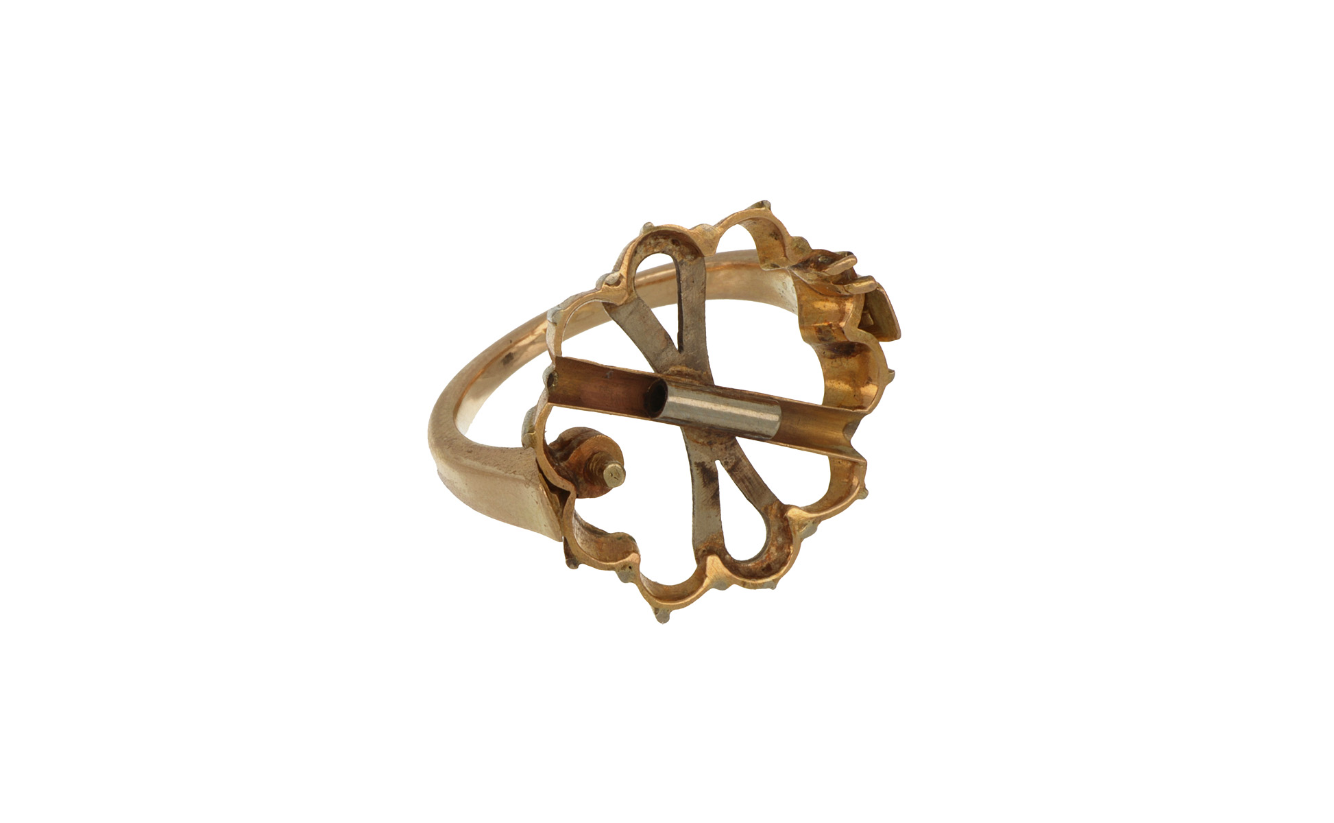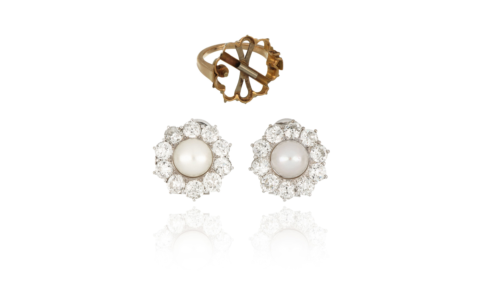 Importanti orecchini anni 50 in oro bianco convertibili in anello dal gambo in oro rosso a contorno a margherita con 20 diamanti di forma rotonda taglio antico per stimati 8/9 ct complessivi e due perle 10 x 6 mm.