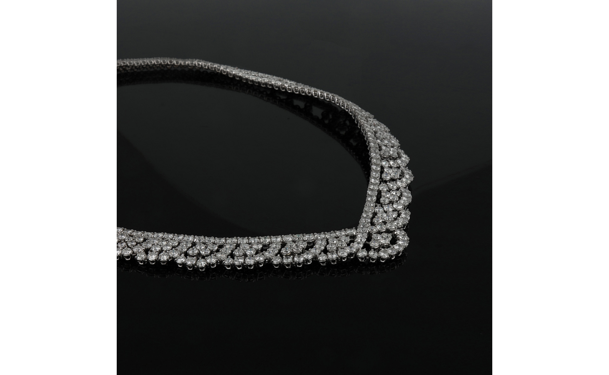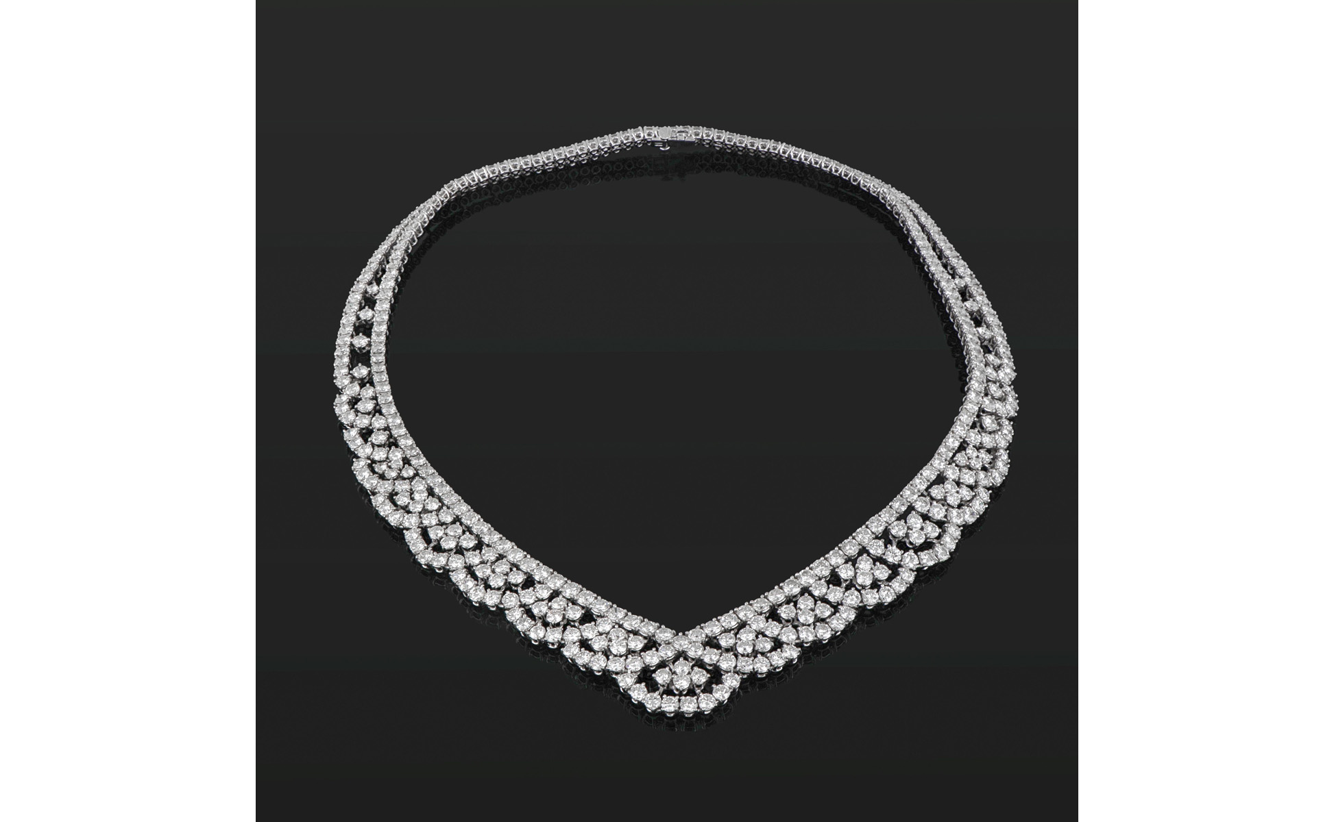 HAFNER elegante girocollo in oro bianco la lavorazione di questo gioiello a castoni interamente snodati veste questa cascata di diamanti taglio brillante per ct. 30 0 ca. come un tessuto un classico dell'alta gioielleria.