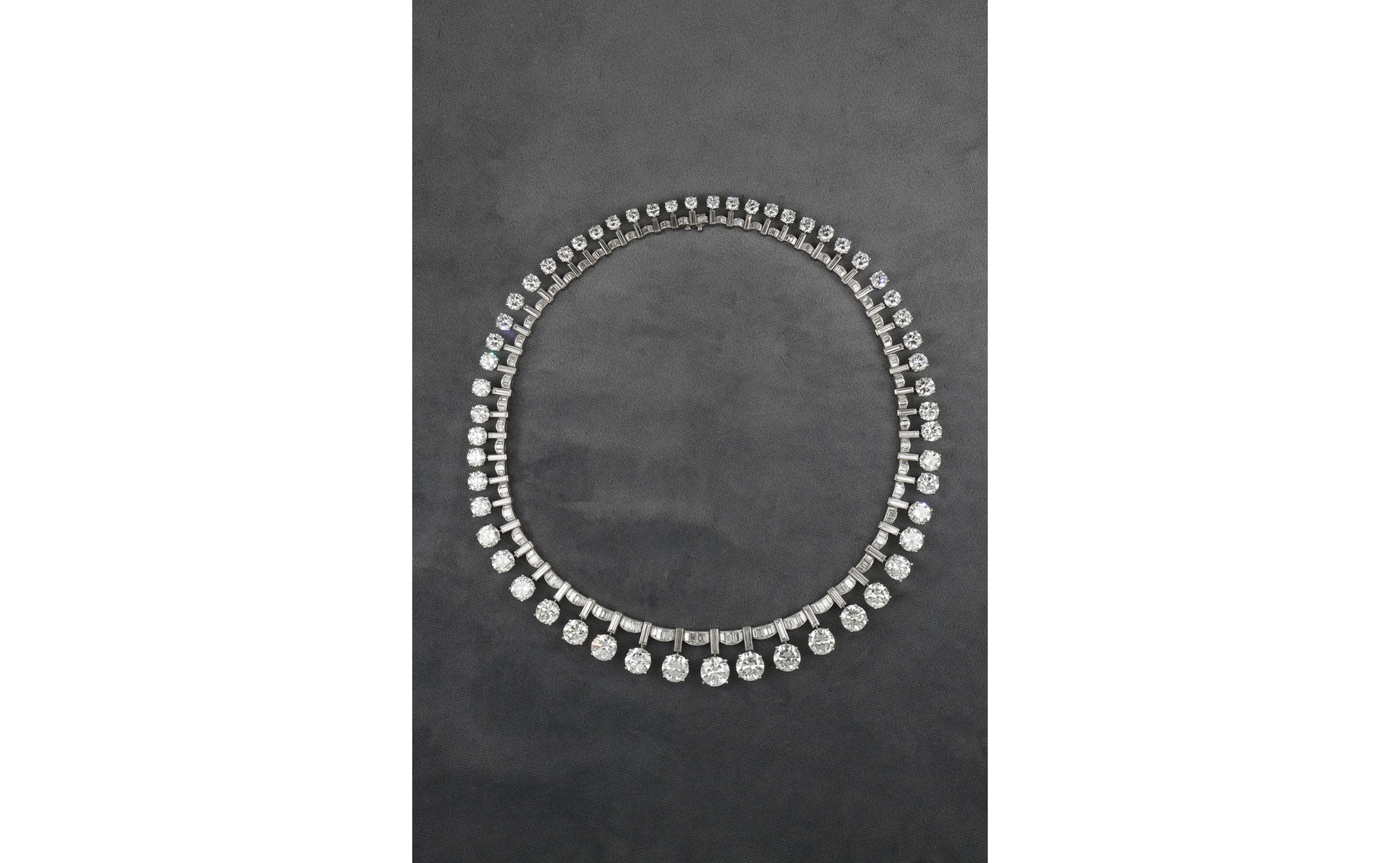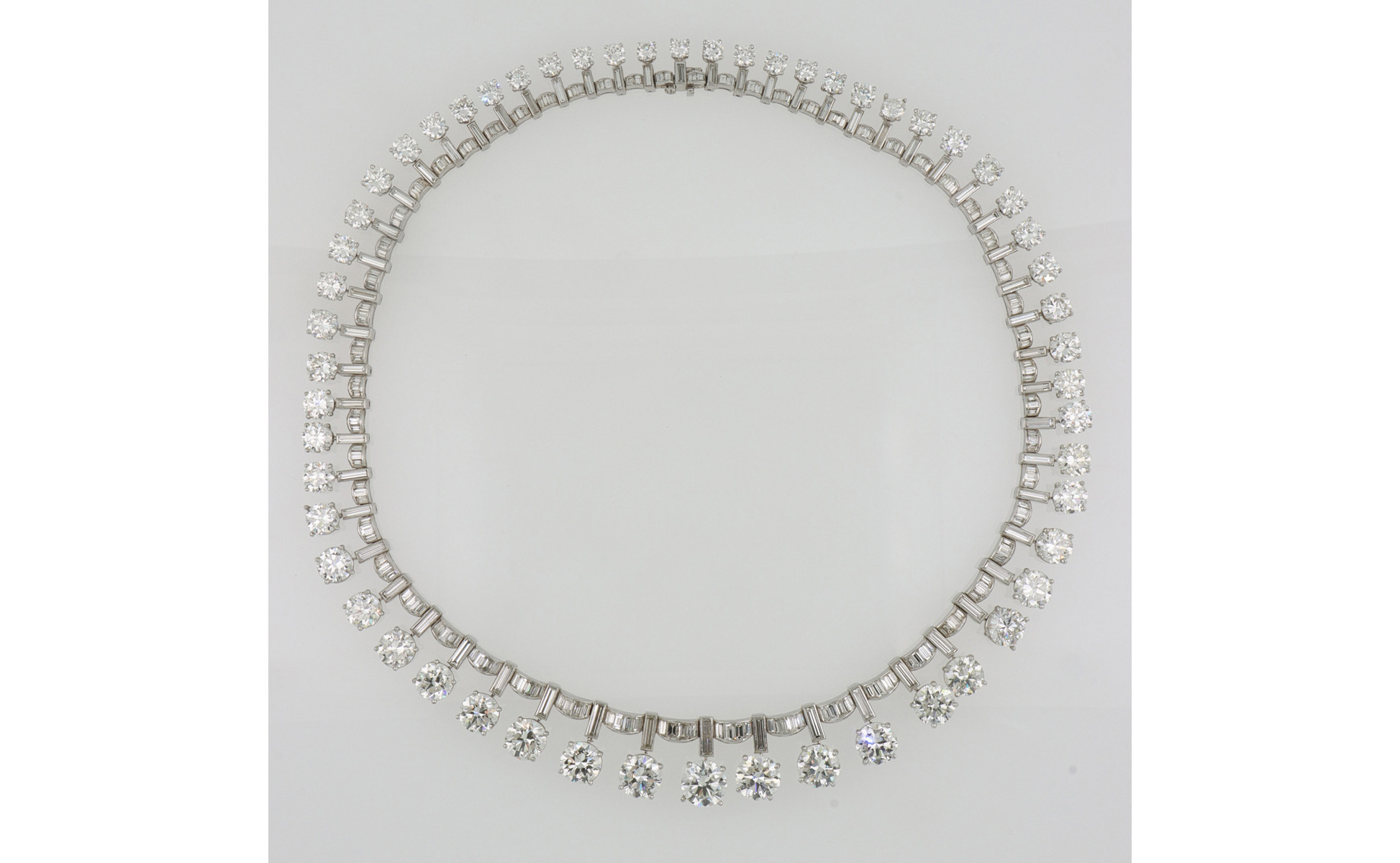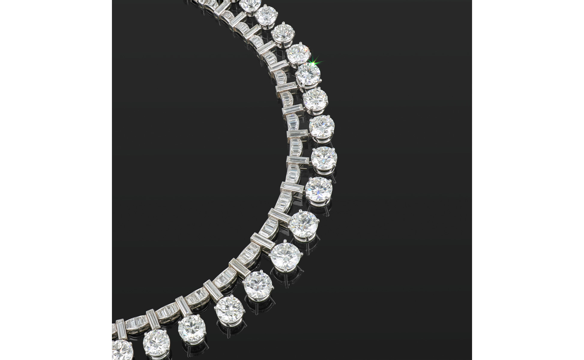Il collier si estende su volute di baguette con castoni pendenti su cui sono montati a griffe 56 diamanti di forma rotonda taglio a brillante di cui 7 pietre sono comprese tra 1 e 1 5 ct 8 pietre tra il 1 5 e 1 99 ct e 4 pietre oltre i 2 ct fino ad un massimo di 2 74 ct per la pietra più grande. Segue sul conditional report il dettaglio analitico.