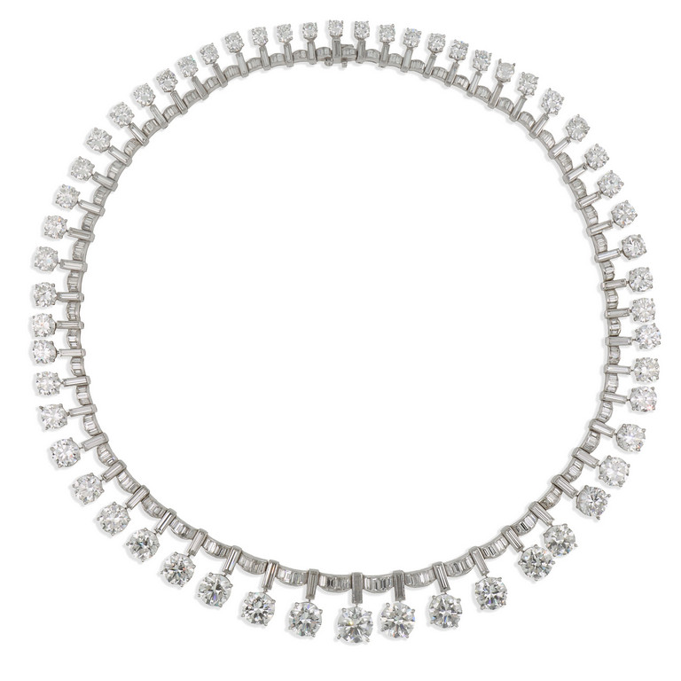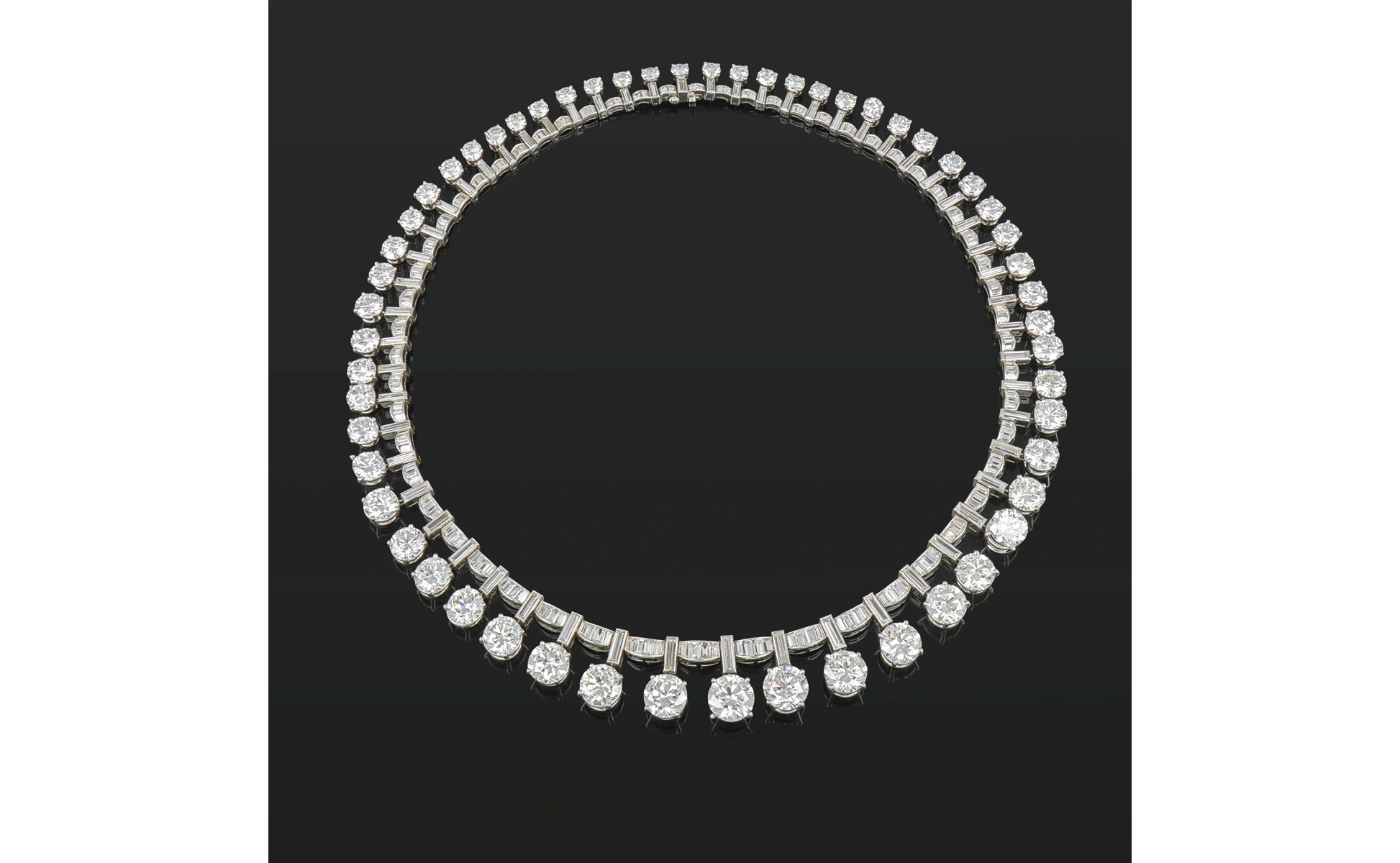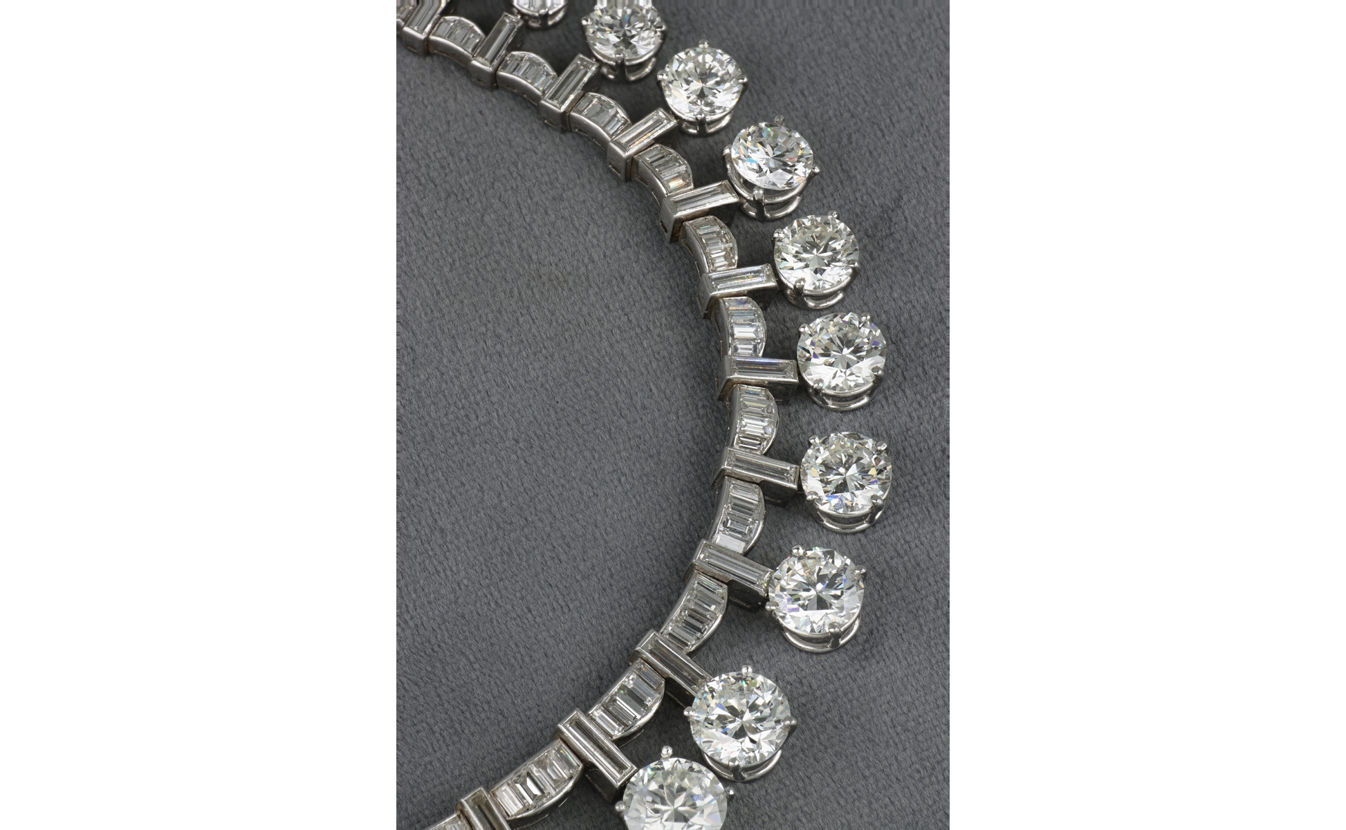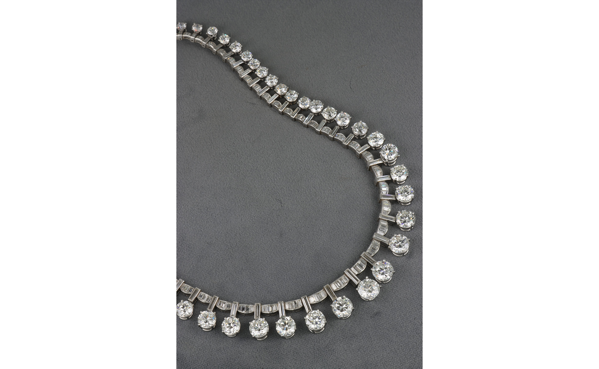 Il collier si estende su volute di baguette con castoni pendenti su cui sono montati a griffe 56 diamanti di forma rotonda taglio a brillante di cui 7 pietre sono comprese tra 1 e 1 5 ct 8 pietre tra il 1 5 e 1 99 ct e 4 pietre oltre i 2 ct fino ad un massimo di 2 74 ct per la pietra più grande. Segue sul conditional report il dettaglio analitico.