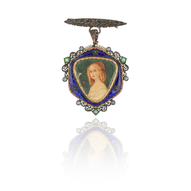 Spilla da cappotto con miniatura realizzata in oro giallo e argento decorata con smalti e piccole perle al centro un ritratto di forma triangolare.