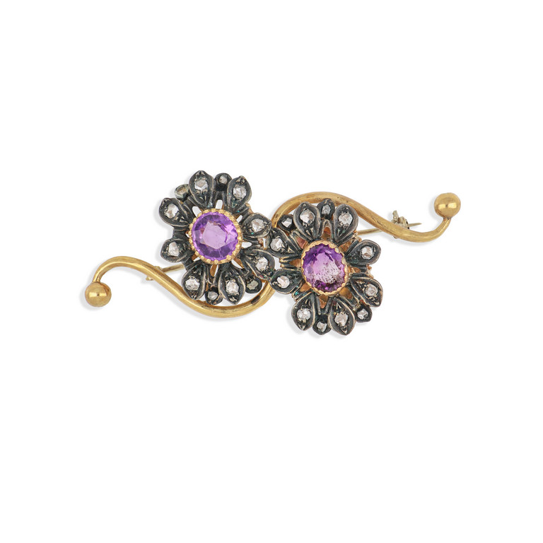 Spilla in oro e argento a doppio fiore con ametiste ovali e diamanti taglio a rosa.