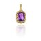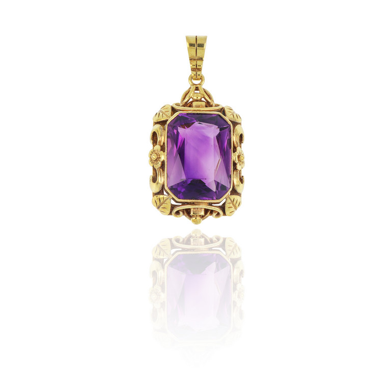 Ciondolo in oro giallo ossidato un quarzo ametista taglio rettangolare dal colore intenso è incastonato in questo gioiello con incisioni floreali.