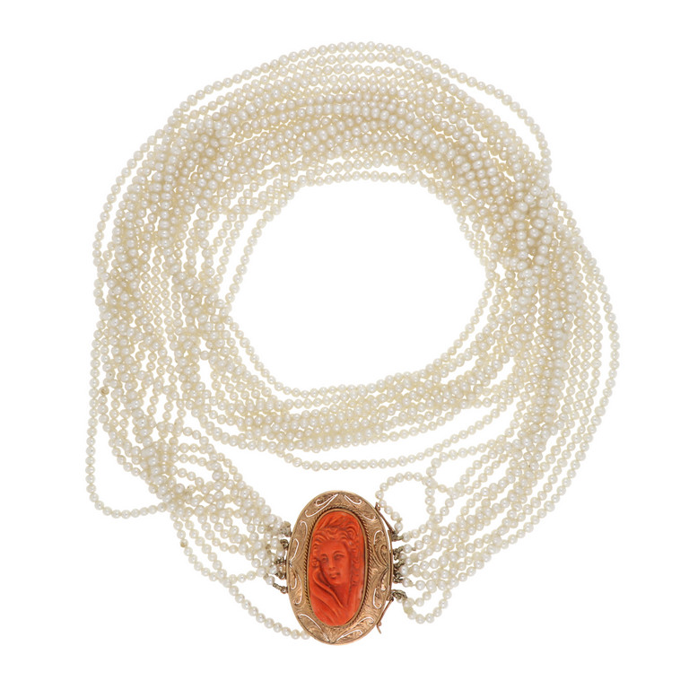 Collana a 8 fili di perle chiusura antica in oro giallo con corallo lavorato raffigurante volto di donna.