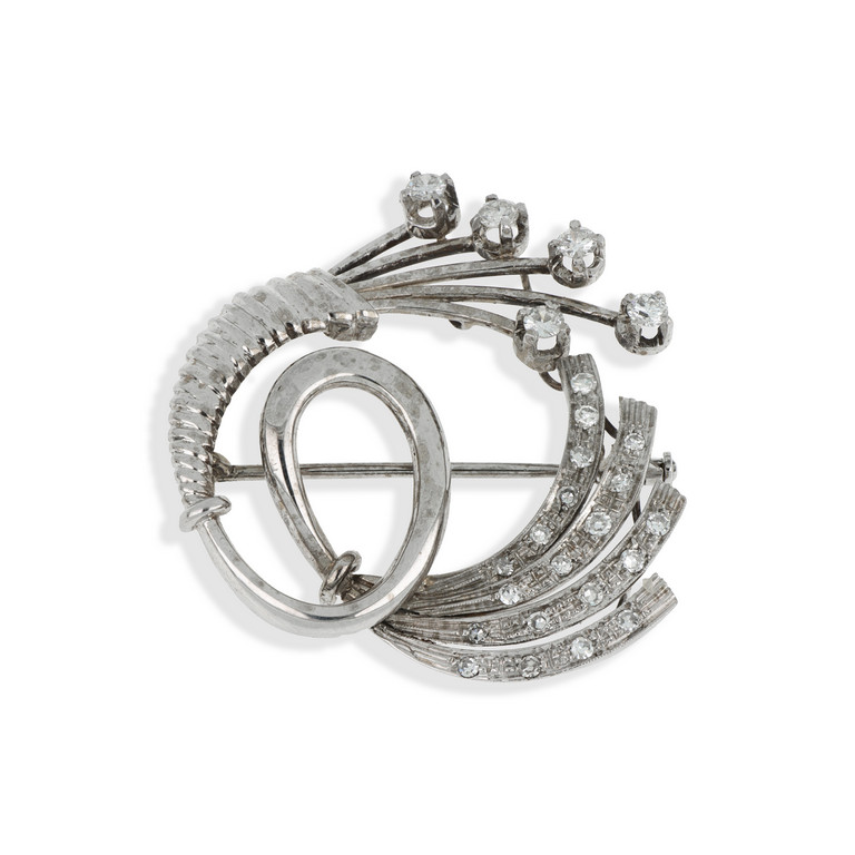 Spilla in oro bianco a forma di cornucopia ritorta e fiorita diamanti taglio brillante e 8/8 per stimati ct. 0 70.