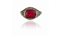 Anello in oro bianco traforato piccoli diamanti tra le volute incise al centro una pietra rossa di sintesi.