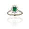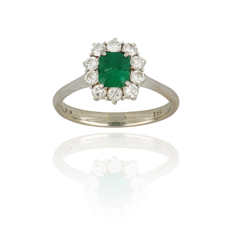 Anello a contorno stile margherita in oro bianco con smeraldo centrale (fratturato) di stimati 0 90 ct completano 10 diamanti di forma rotonda taglio a brillante per tot 0 80 ct stimati.