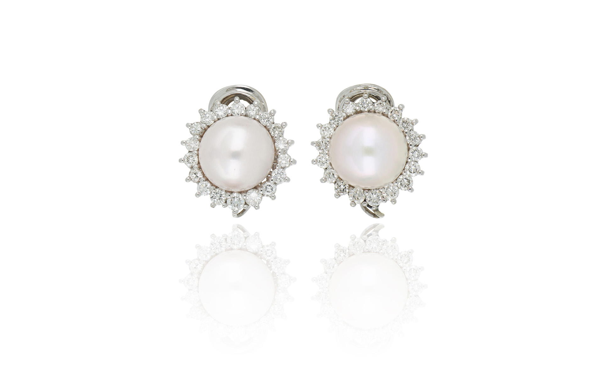 Orecchini a clips in oro bianco due perle giapponesi coltivate di 9 5 mm di diametro sono contornate da diamanti taglio brillante per ct. 0 80 ca.