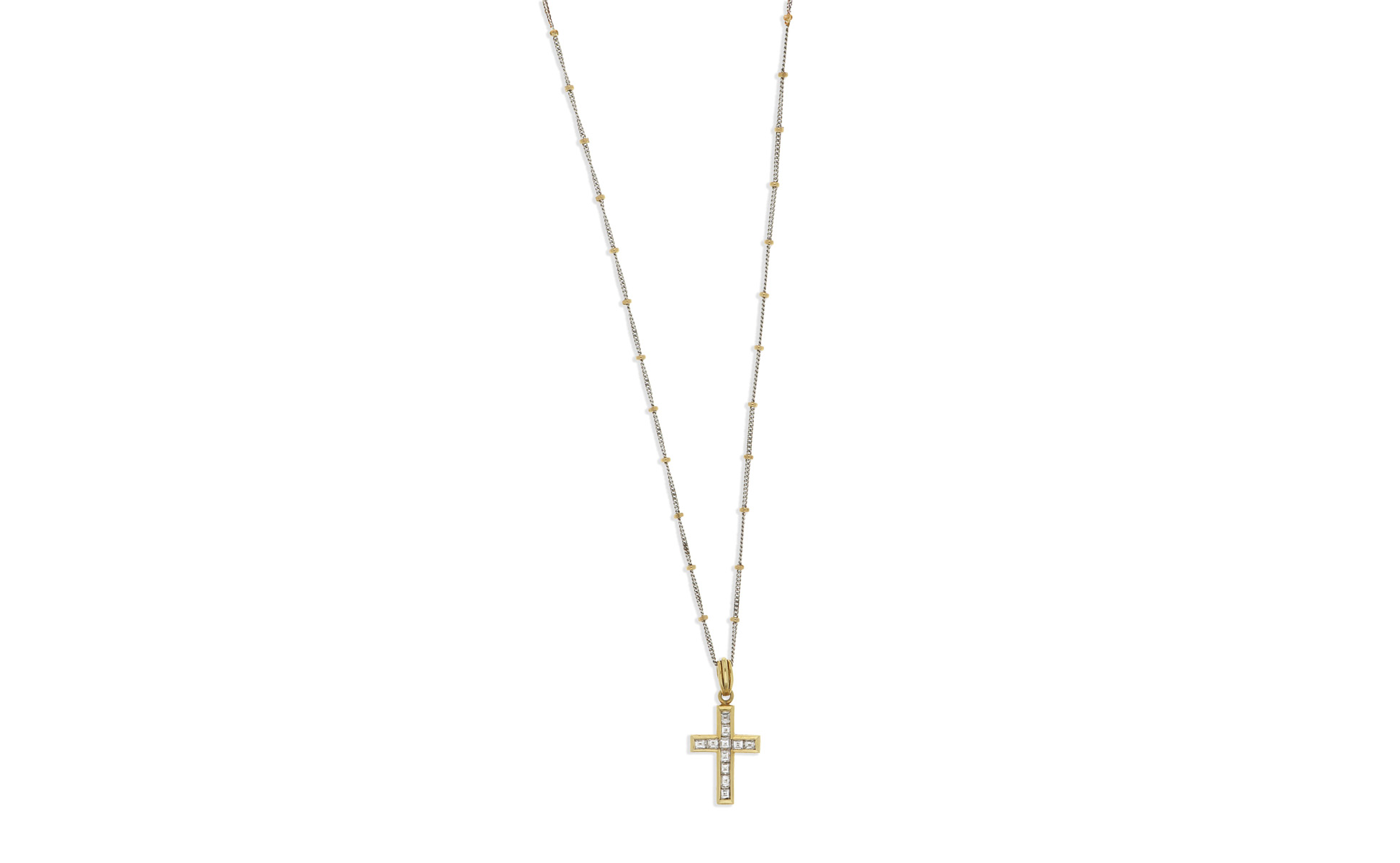 Collanina in oro giallo e bianco con crocetta pendente incastonata da diamanti di forma carrè per stimati 0 60 ct.