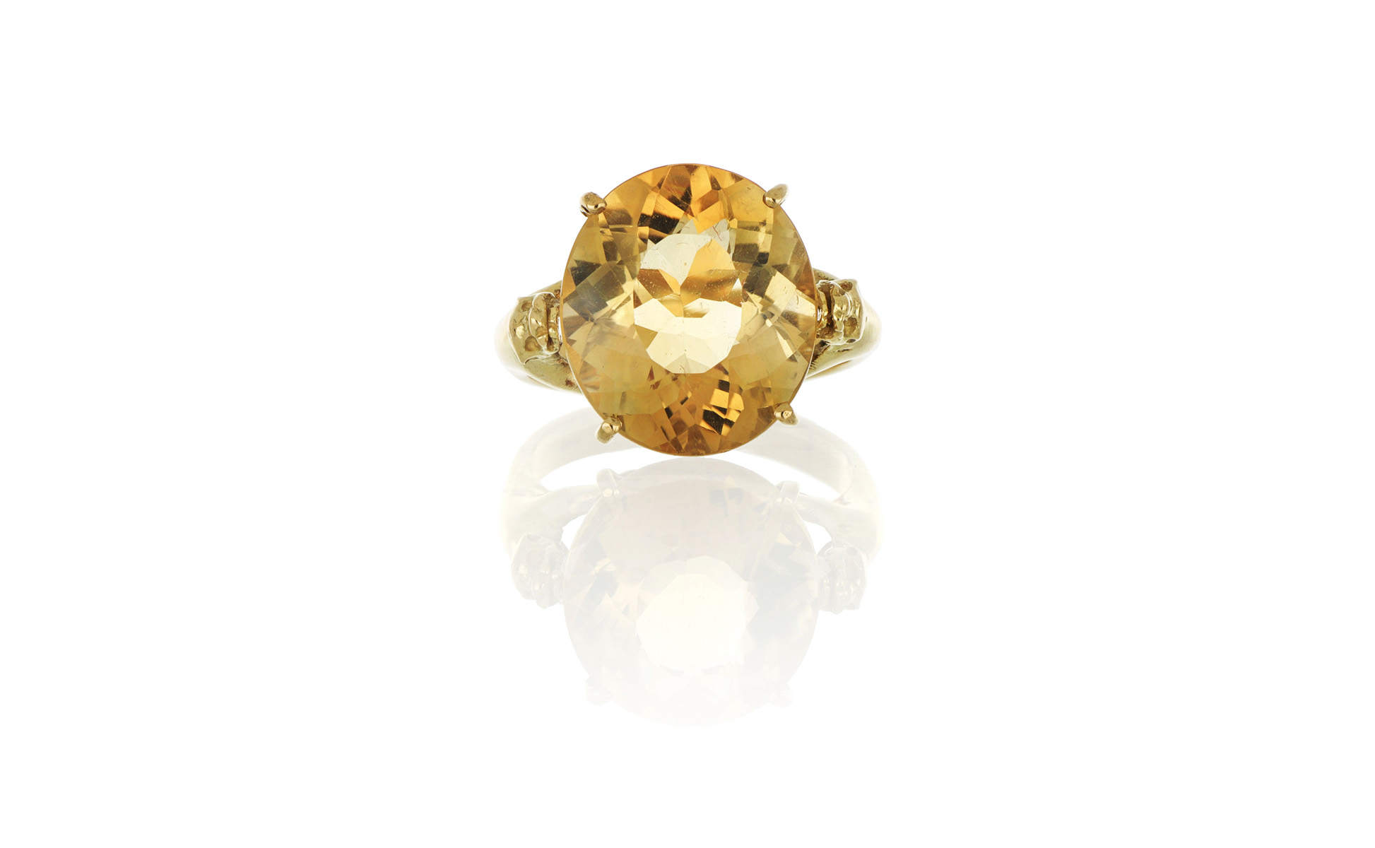 Anello in oro giallo con grande quarzo citrino taglio ovale sostenuto da due pantere stilizzate ai lati.