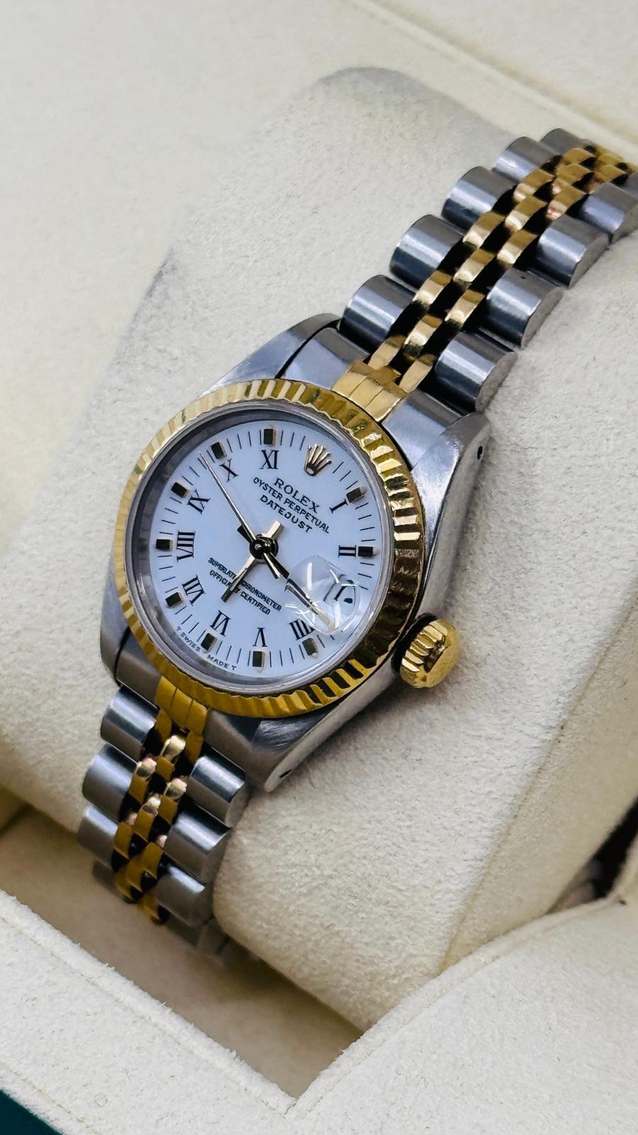 Marca Rolex Modello (Orologio) Lady-Datejust Numero di referenza 69173 Carica Automatico Materiale della cassa Oro/Acciaio Materiale cinturino Oro/acciaio Anno di produzione 1991 (Anno approssimativo) Condizione Usato (Ottimo) L'articolo presenta segni di usura lievi, come ad esempio graffi leggeri, ma non percepibili al tatto. Corredo documenti originali, no box Cassa Materiale della cassa Oro/Acciaio Diametro 26 mm Impermeabile 10 ATM Materiale lunetta Oro giallo Vetro Vetro zaffiro Materiale cinturino Oro/acciaio Colore cinturino Oro/acciaio Chiusura Déployante Materiale chiusura - COMMISSIONE D’ASTA 25%